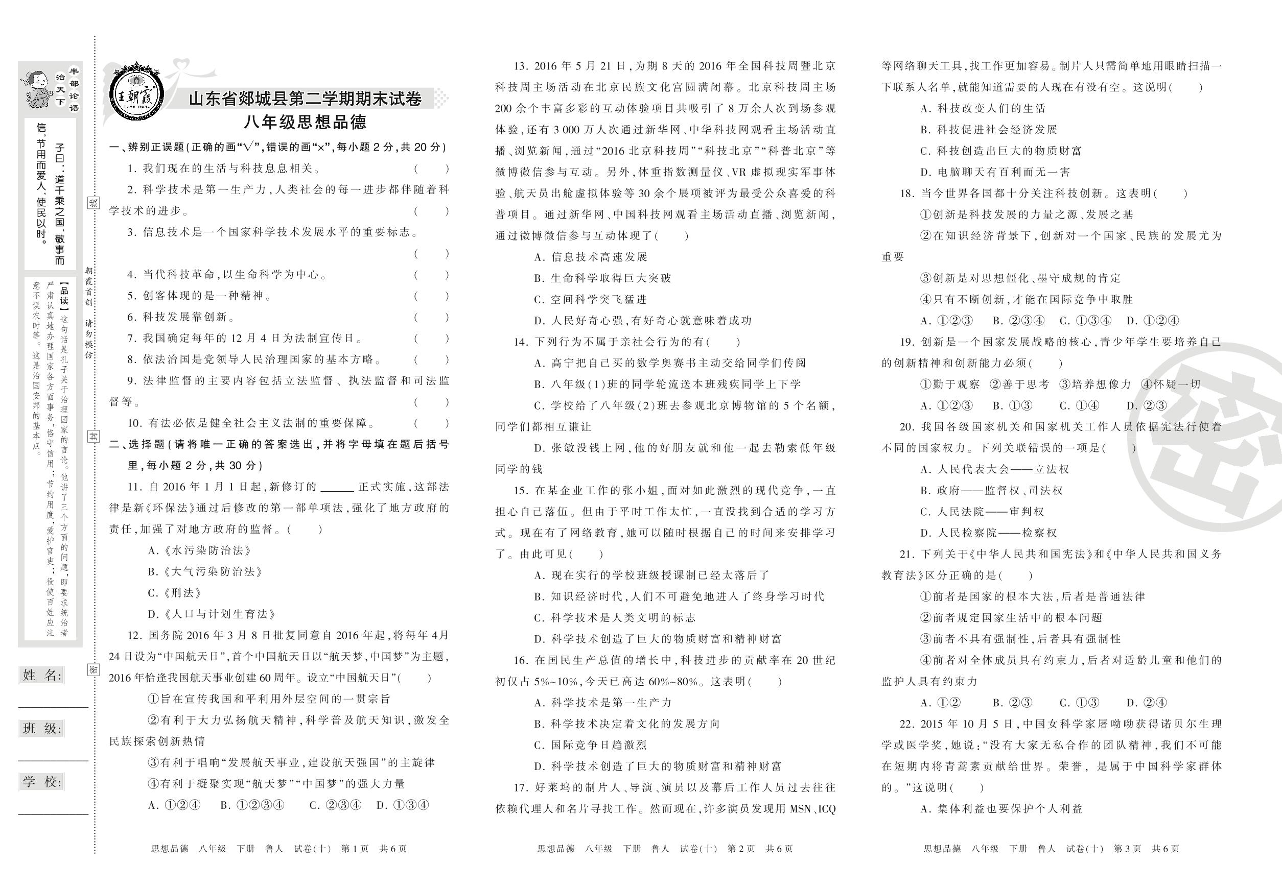 2015-2016学年第二学期临沂市山东省郯城县八年级道德与法治试卷(鲁人版)【10】
