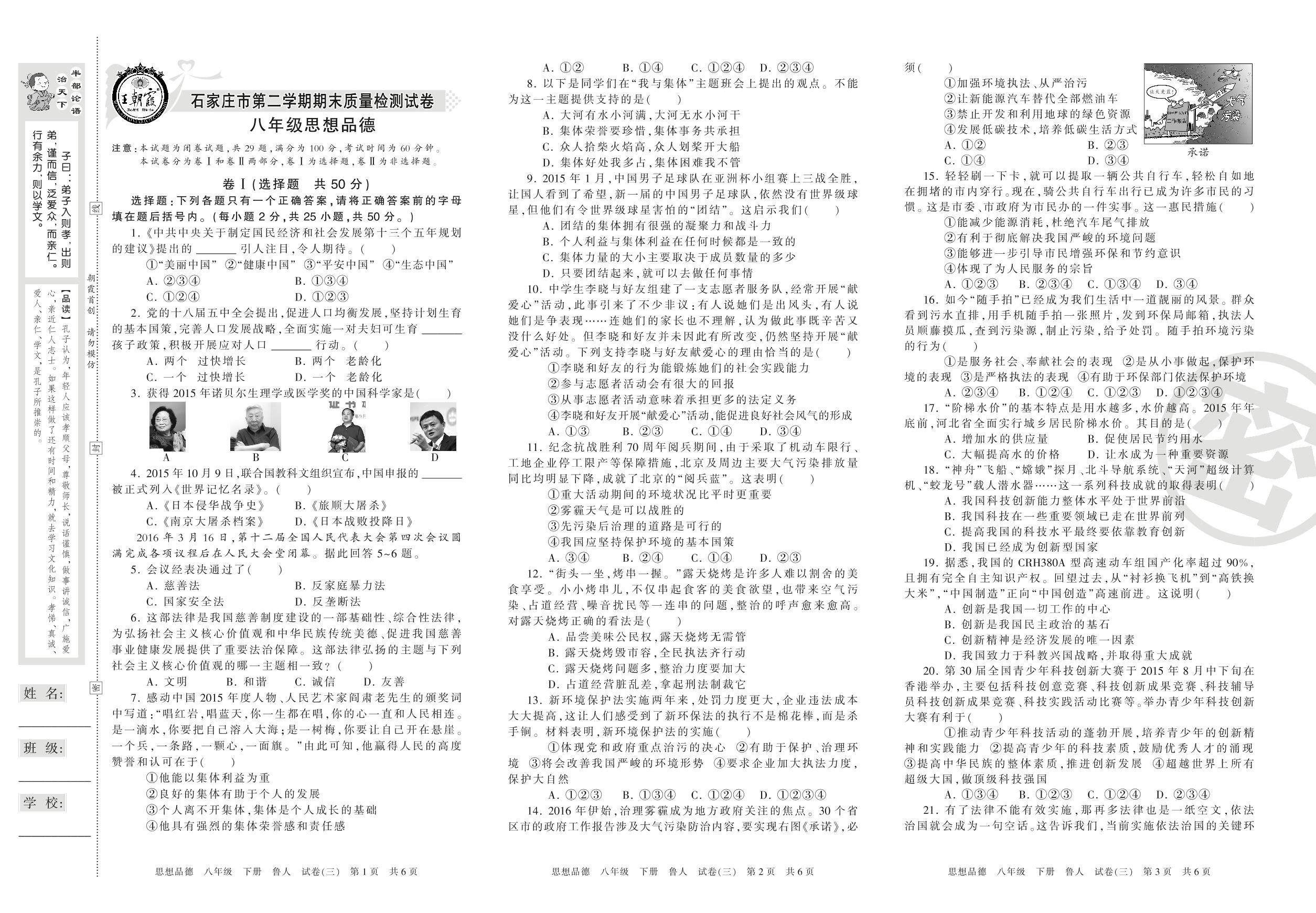 2015-2016学年第二学期石家庄市八年级道德与法治试卷(鲁人版)【3】