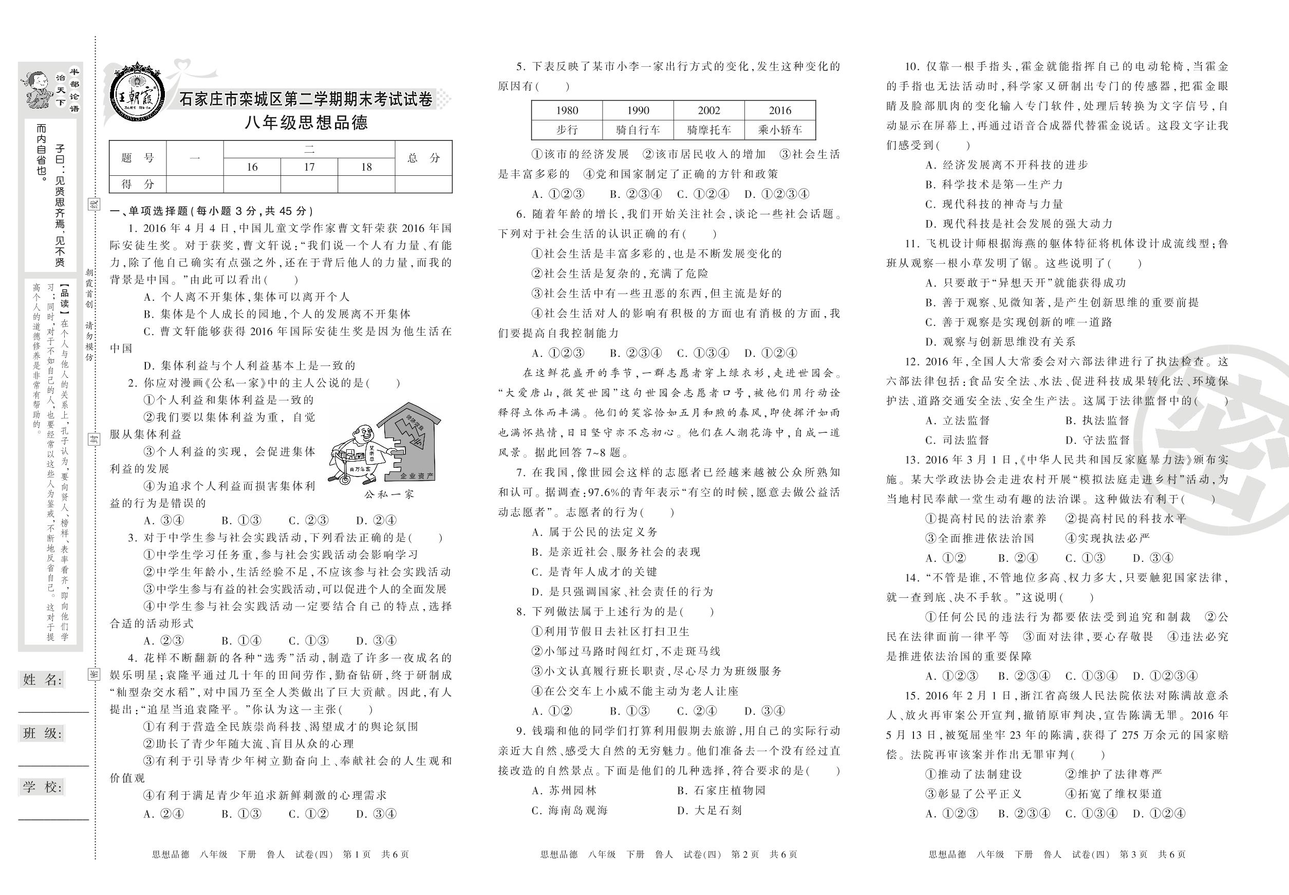 2015-2016学年第二学期石家庄市栾城区八年级道德与法治试卷(鲁人版)【4】