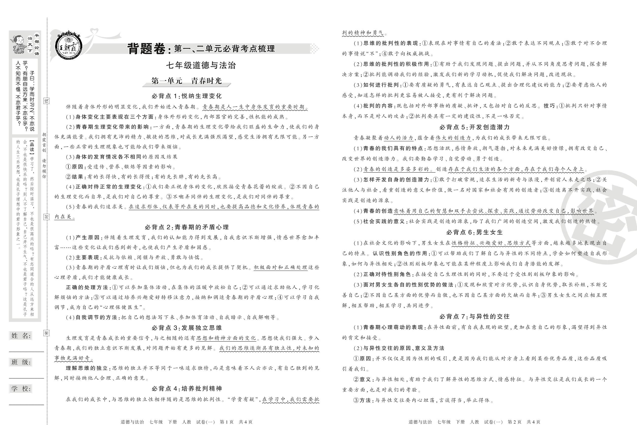 王朝霞期末背题卷——第一、二单元必背考点梳理七年级下册道德与法治(人教版)_R210812150059【1】