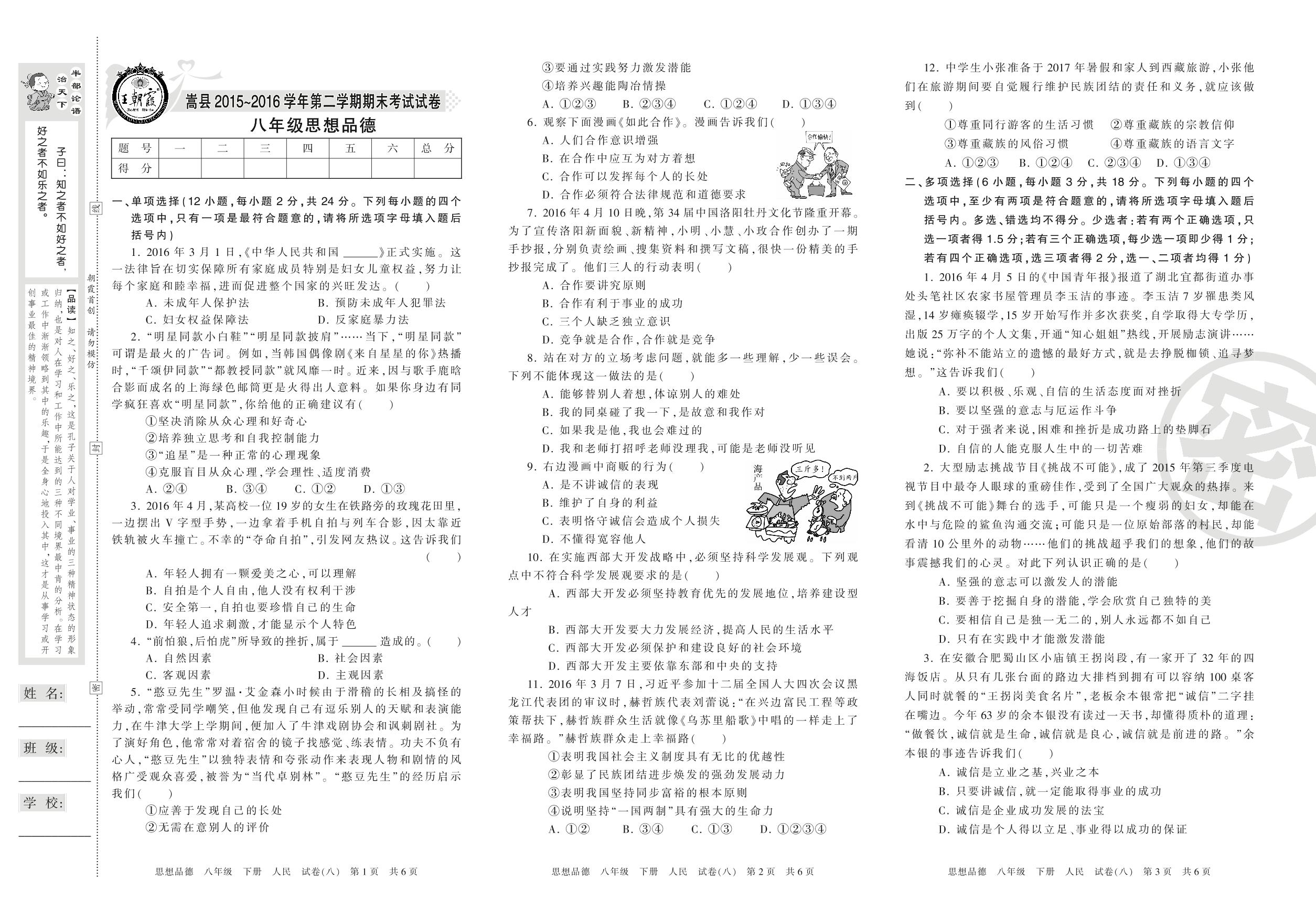 2015-2016学年第二学期洛阳市嵩县八年级道德与法治试卷(人民版)【8】