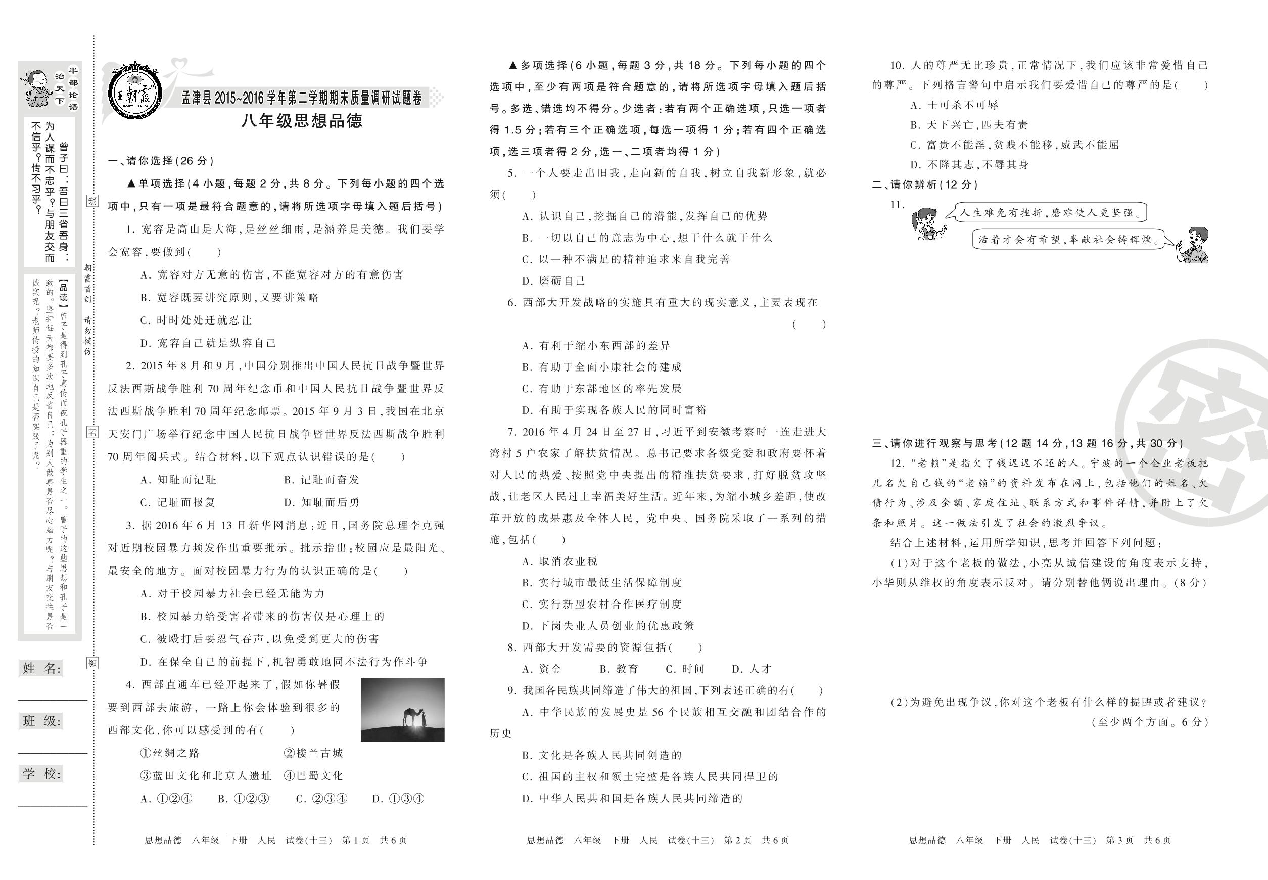 2015-2016学年第二学期洛阳市孟津县八年级道德与法治试卷(人民版)【13】