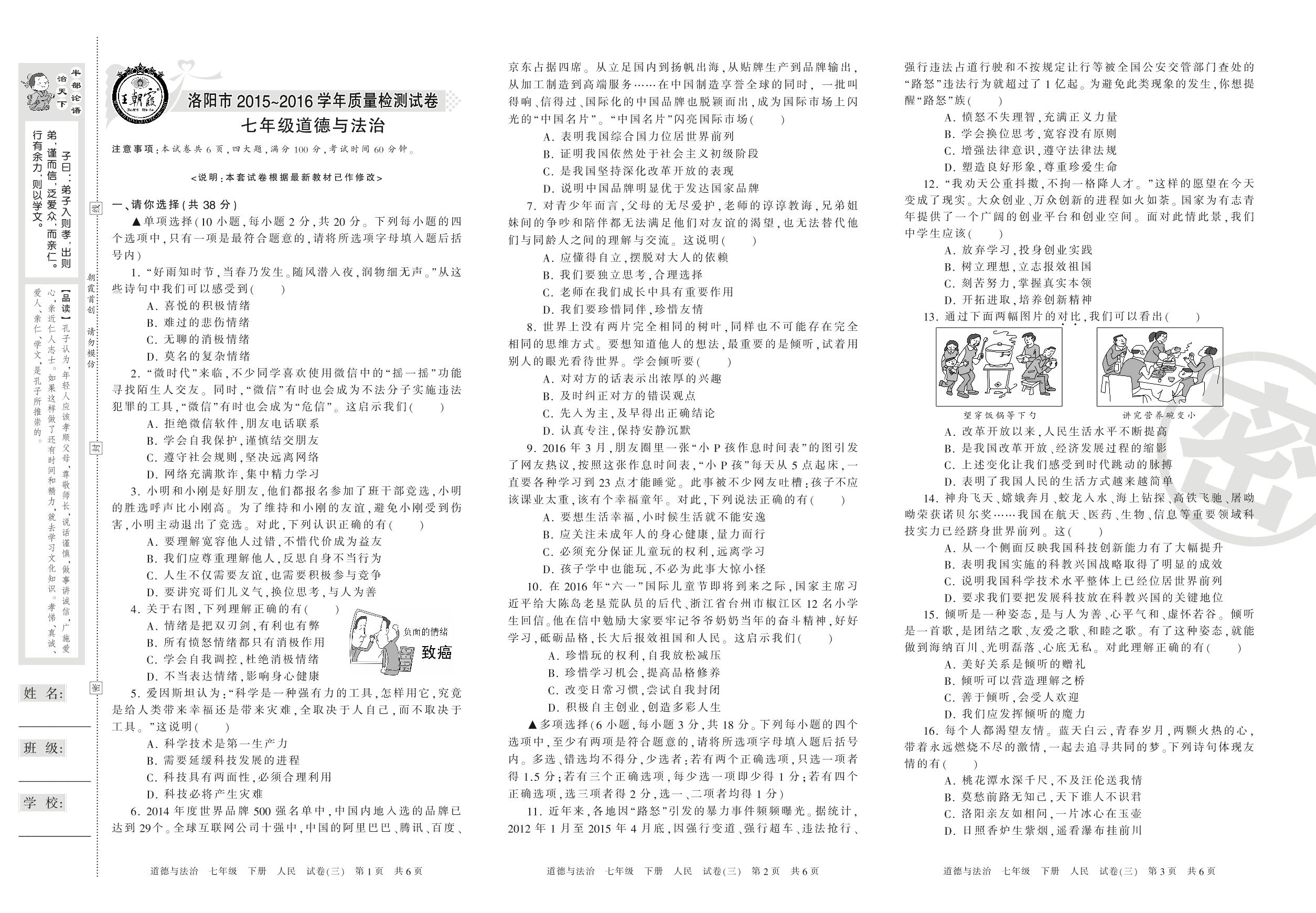 2015-2016学年第二学期洛阳市七年级道德与法治试卷(人民版)【3】
