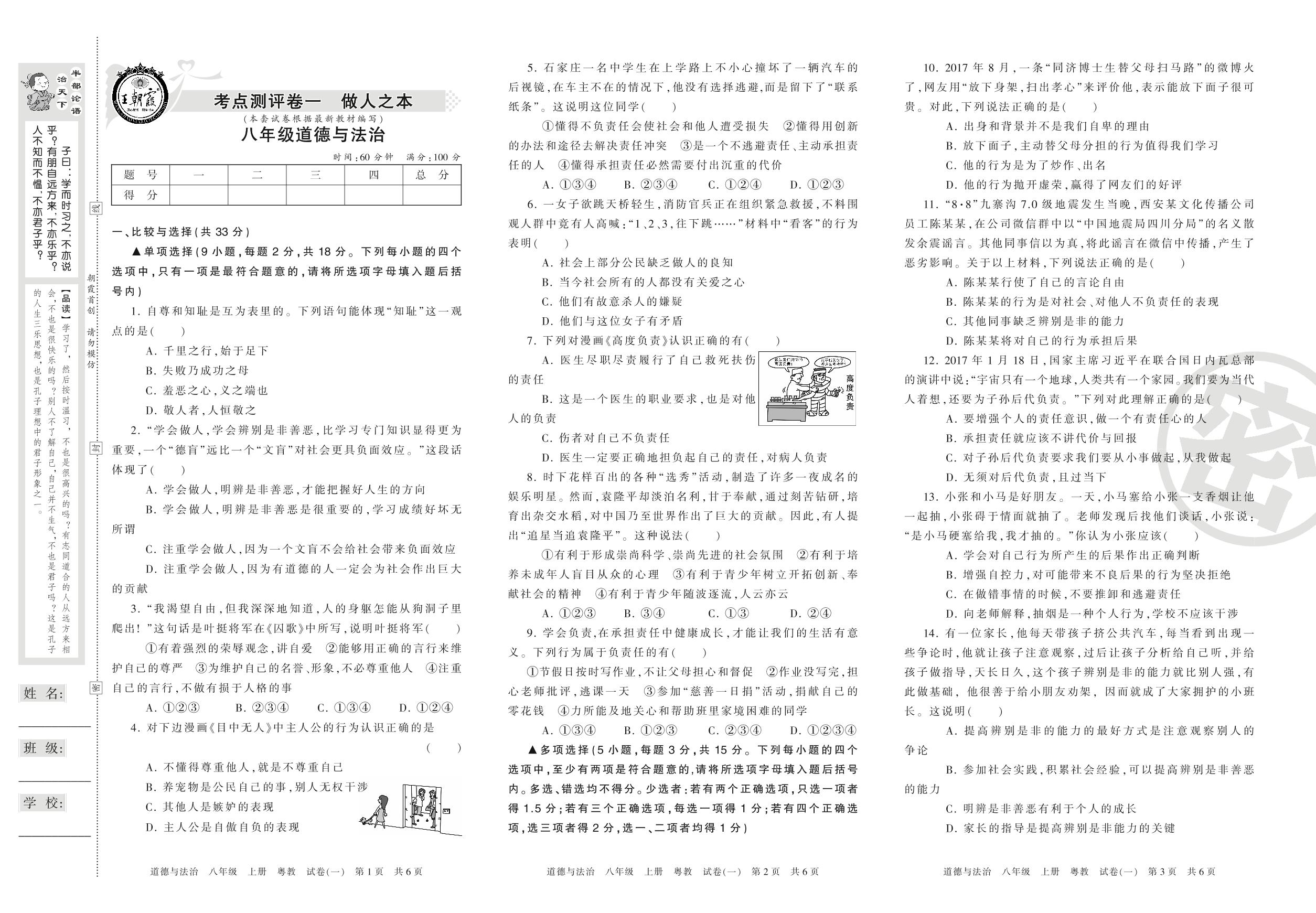 八年级道德与法治粤教版上册单元卷