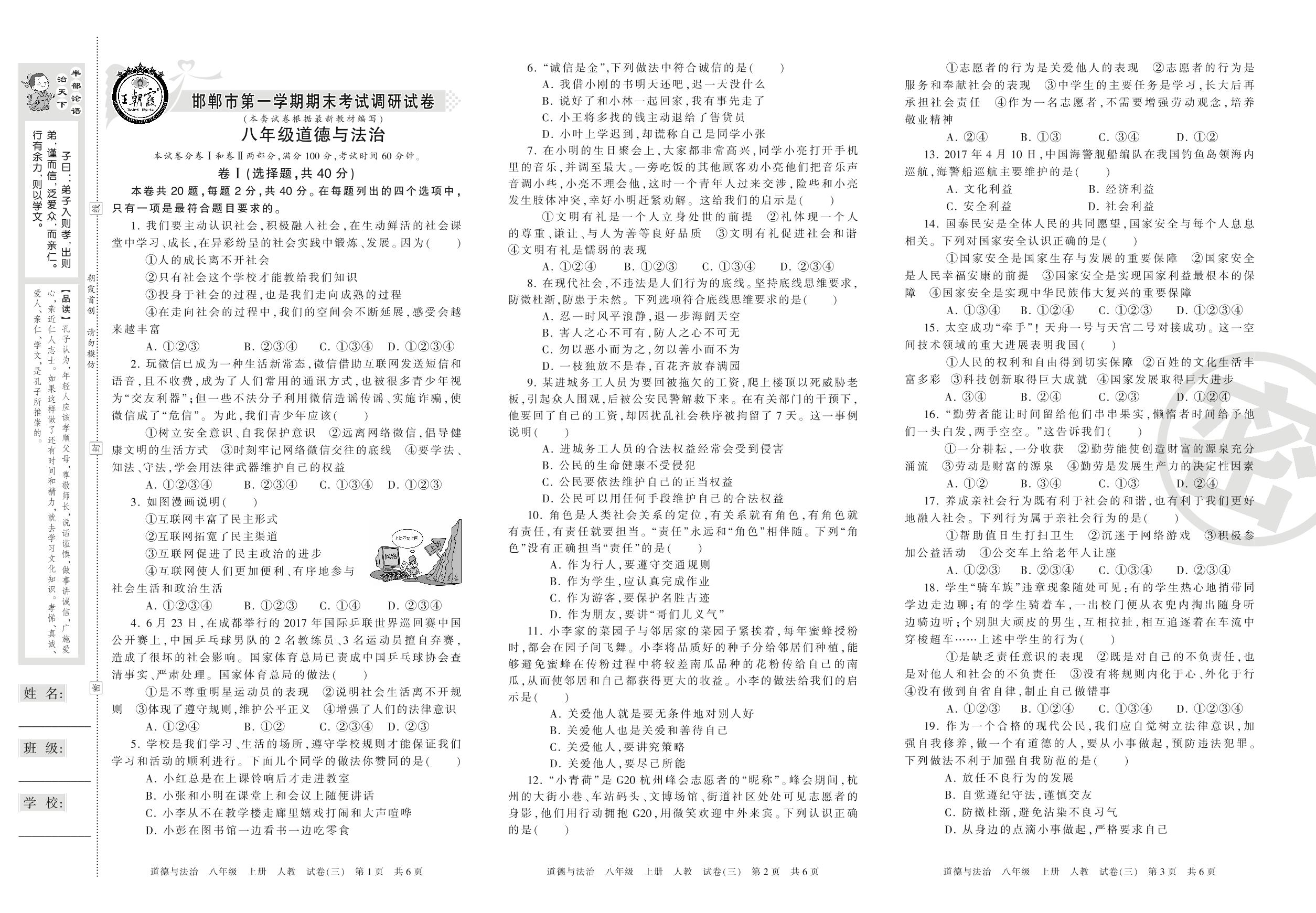 2016-2017学年第一学期邯郸市八年级道德与法治试卷(人教版)【3】