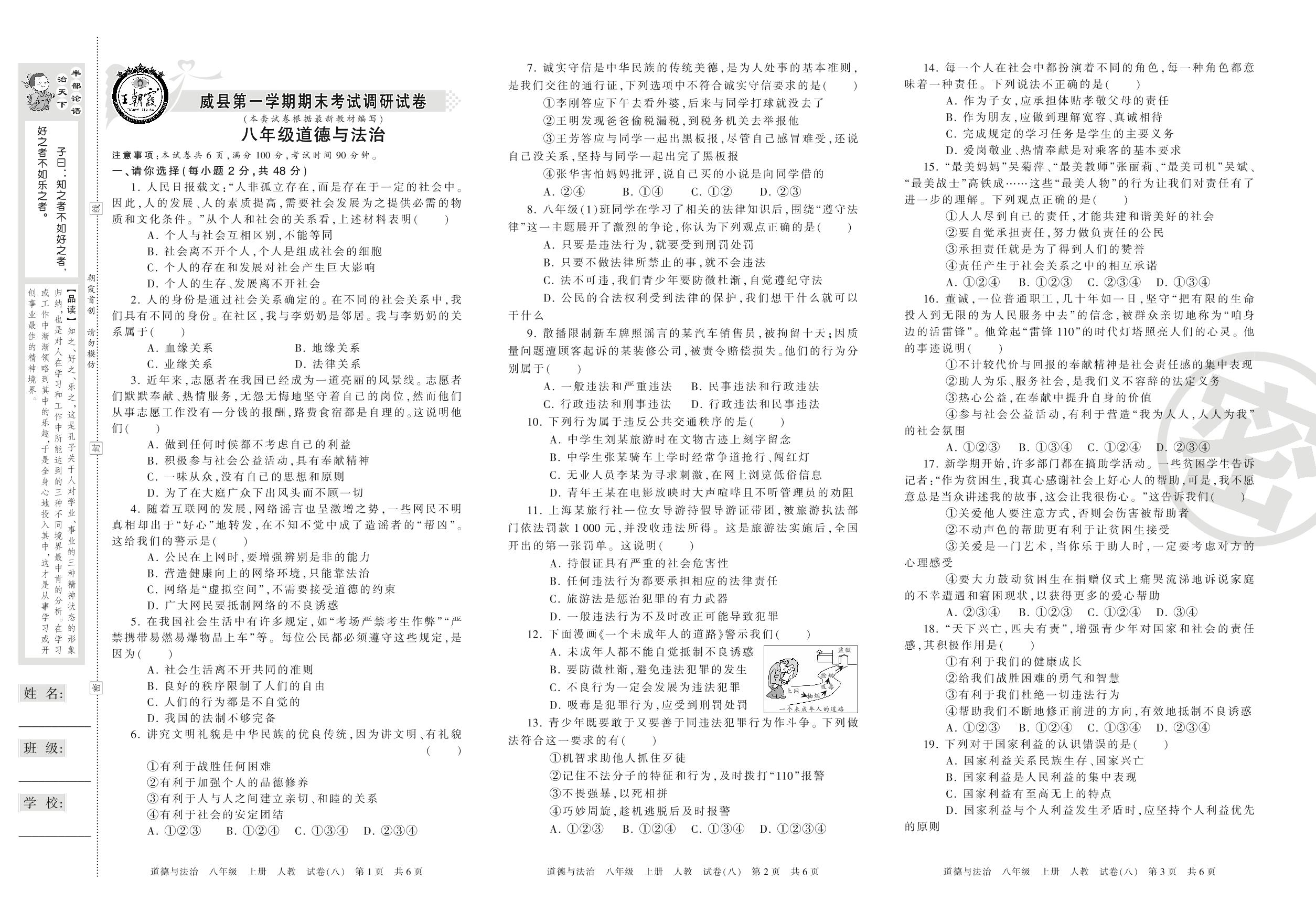 2016-2017学年第一学期邢台市威县八年级道德与法治试卷(人教版)【8】