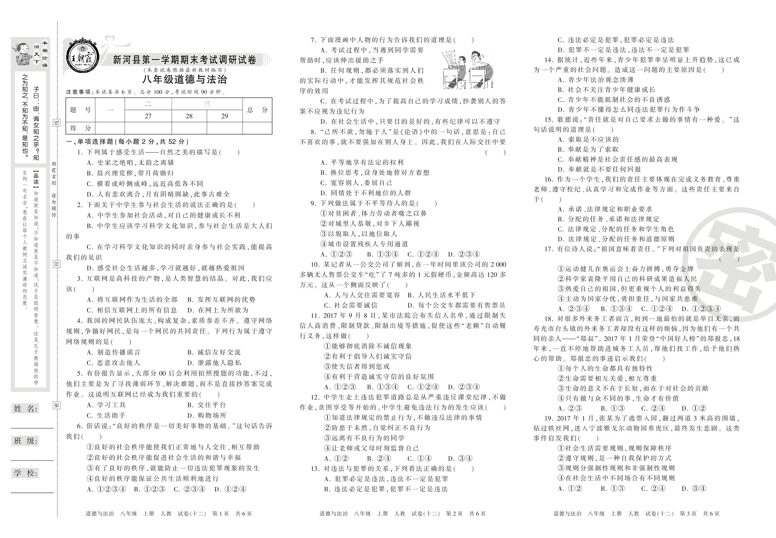 2016-2017学年第一学期邢台市新河县八年级道德与法治试卷(人教版)【12】