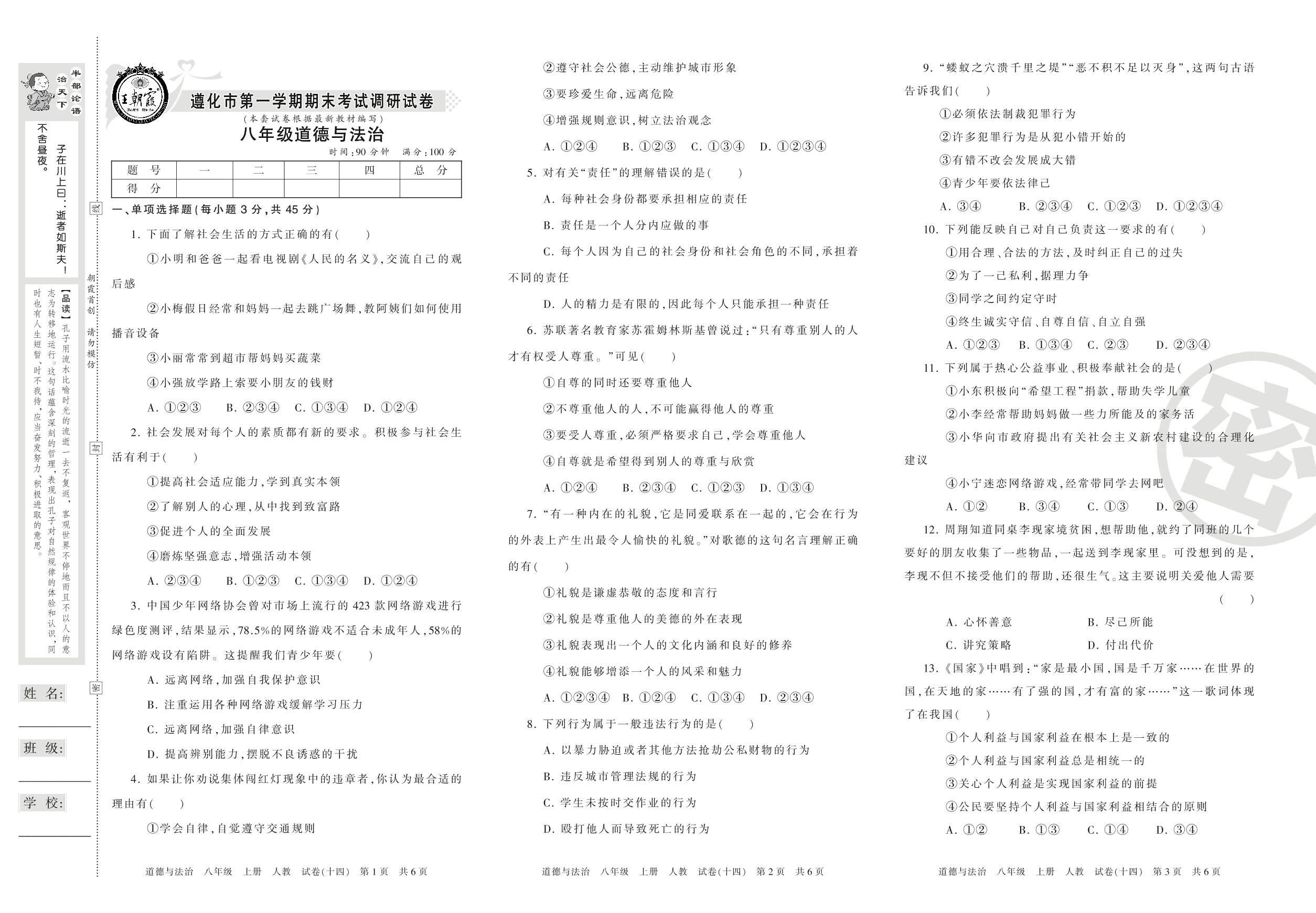 2016-2017学年第一学期遵化市八年级道德与法治试卷(人教版)【14】