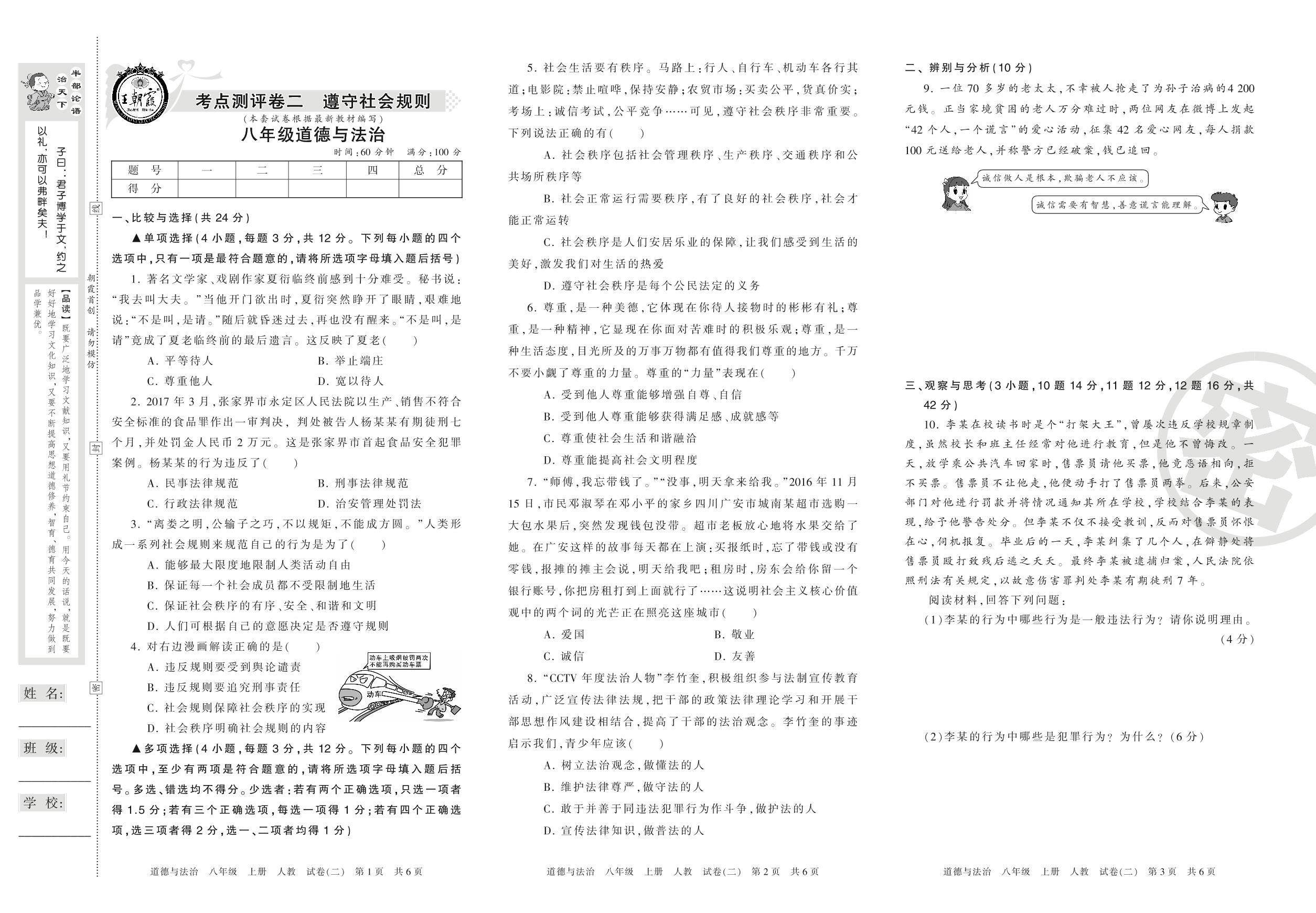 王朝霞期末测评卷八年级上册道德与法治(人教版)【2】