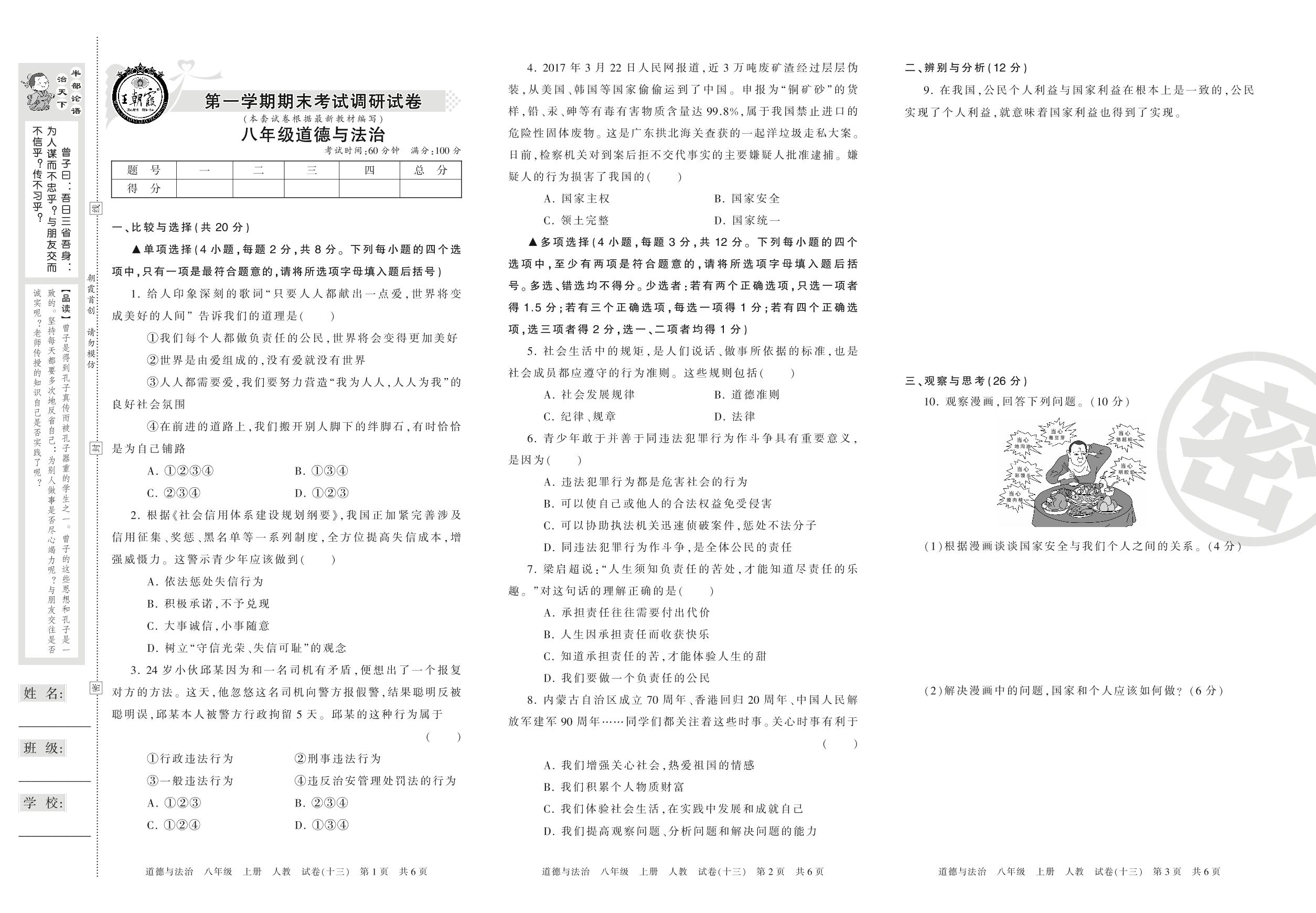 王朝霞期末调研卷八年级上册道德与法治(人教版)【13】