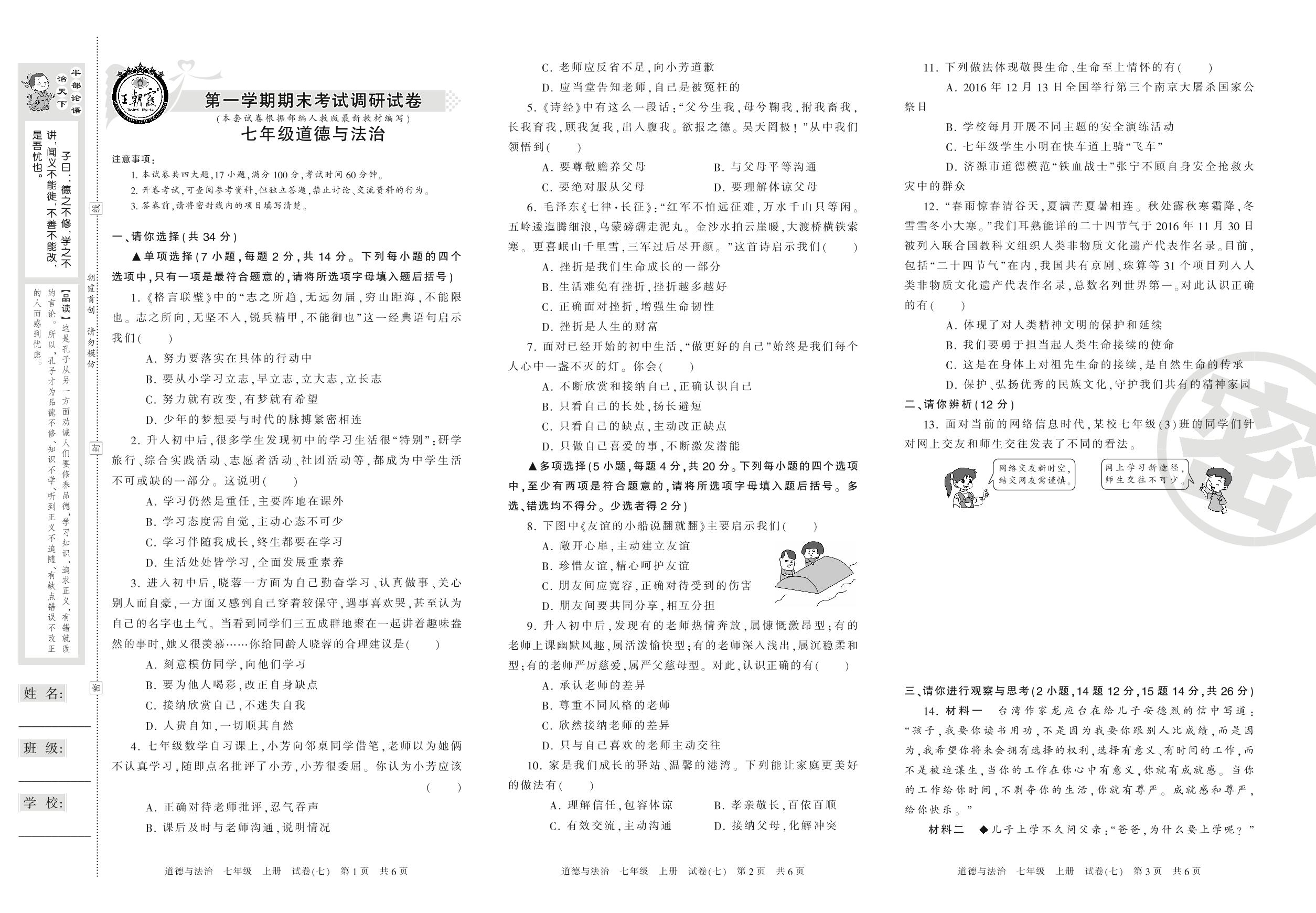 王朝霞期末调研卷七年级上册道德与法治(新课版)【7】
