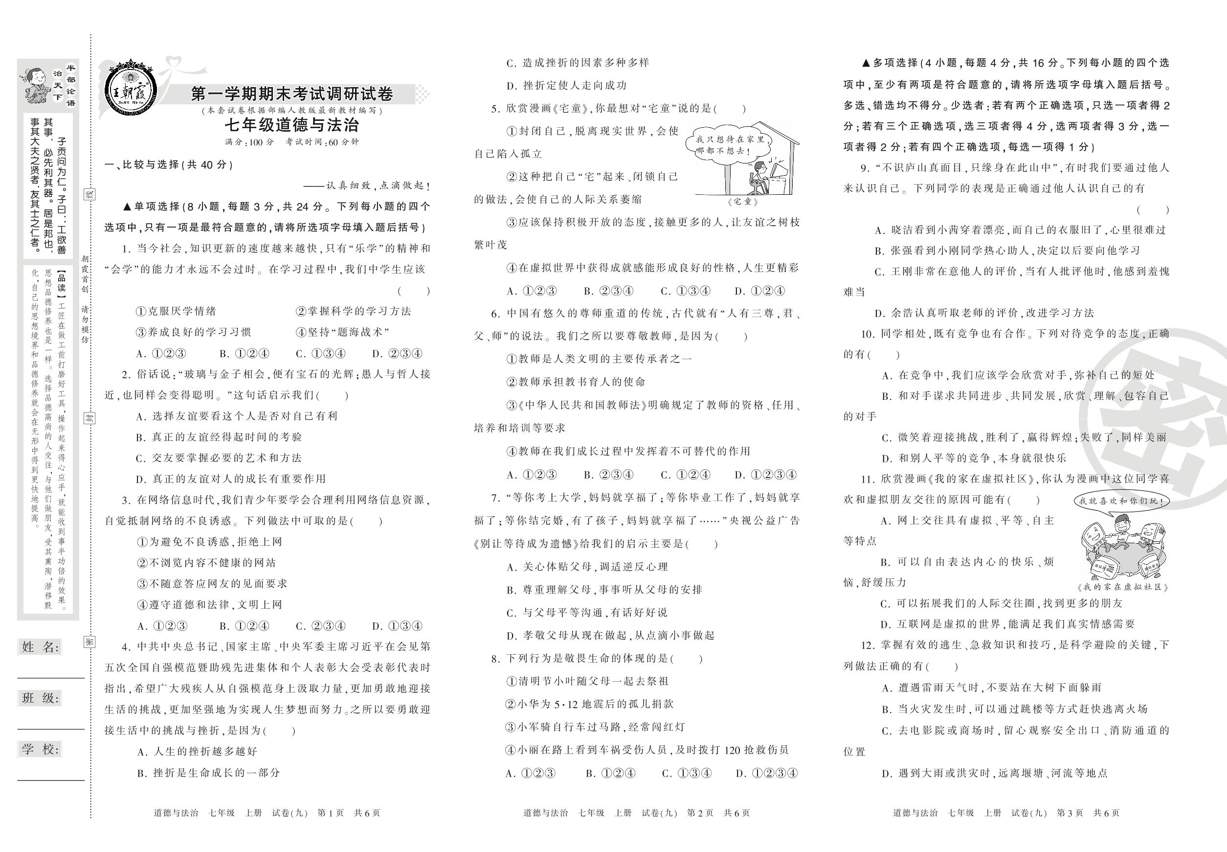 王朝霞期末调研卷七年级上册道德与法治(新课版)【9】