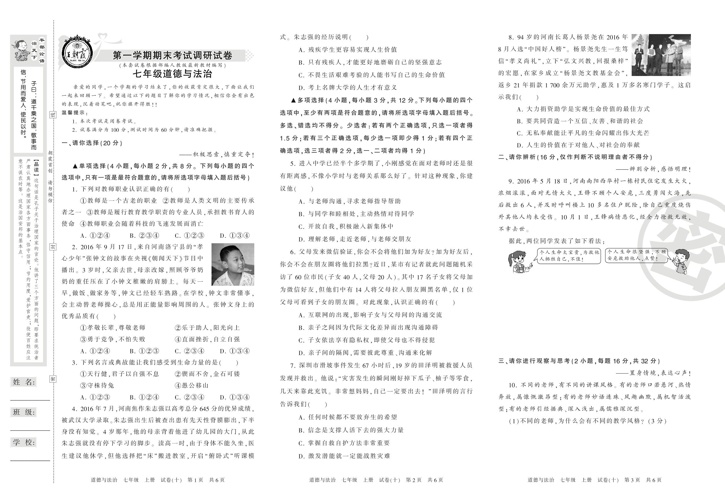 王朝霞期末调研卷七年级上册道德与法治(新课版)【10】