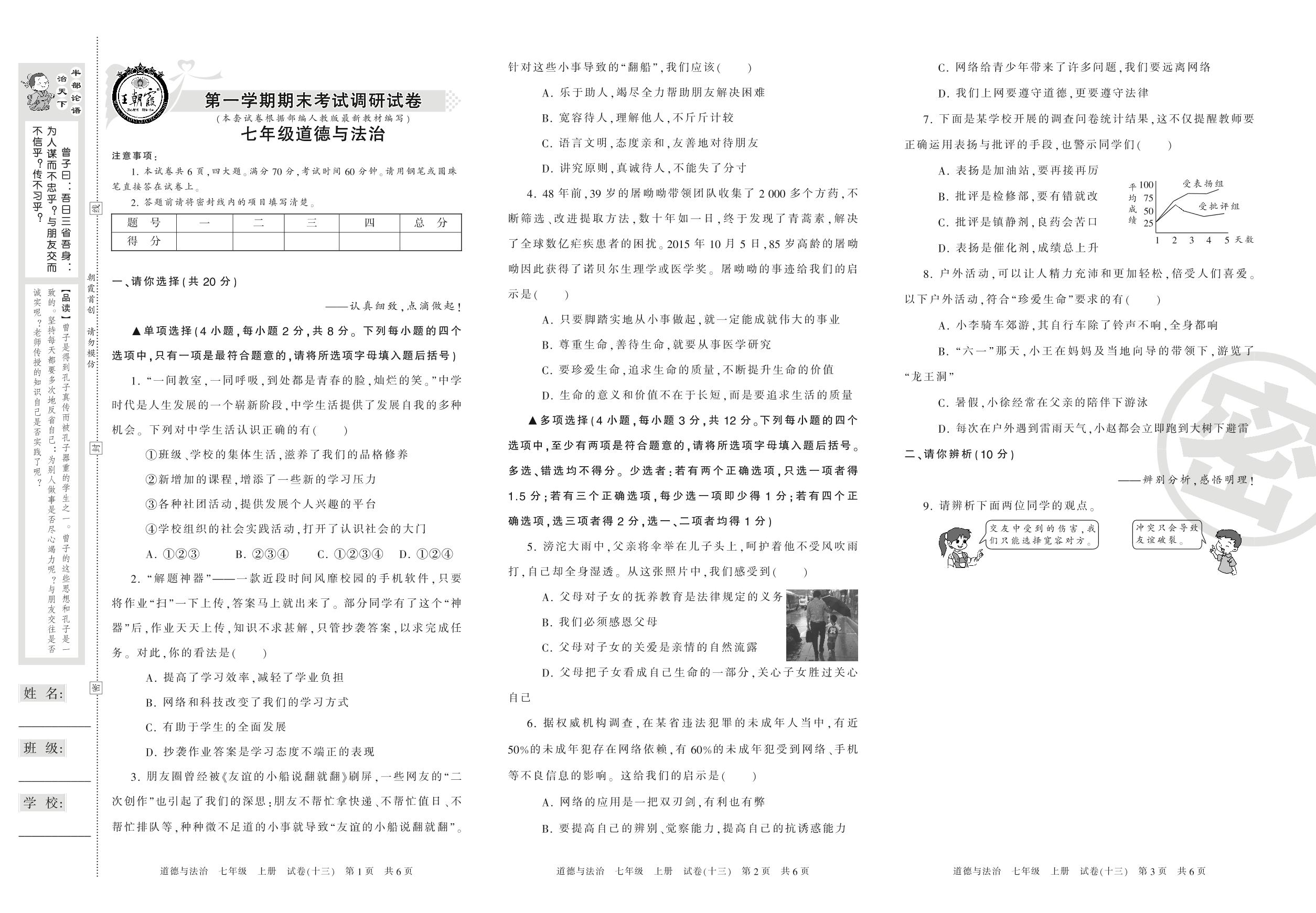 王朝霞期末调研卷七年级上册道德与法治(新课版)【13】