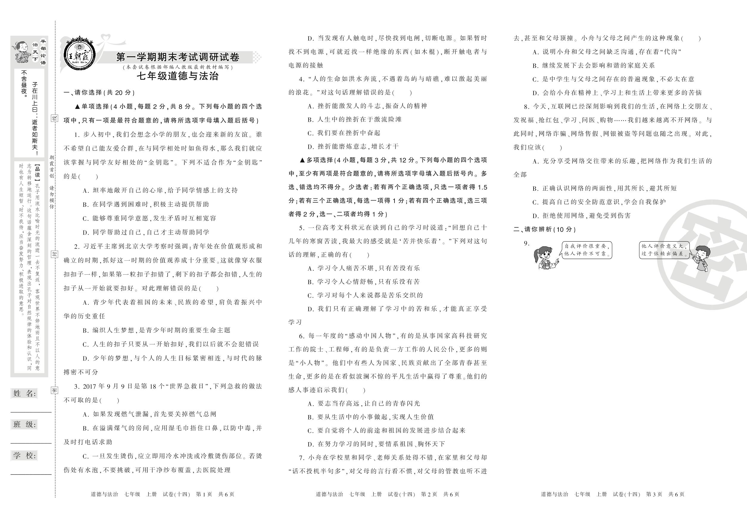 王朝霞期末调研卷七年级上册道德与法治(新课版)【14】