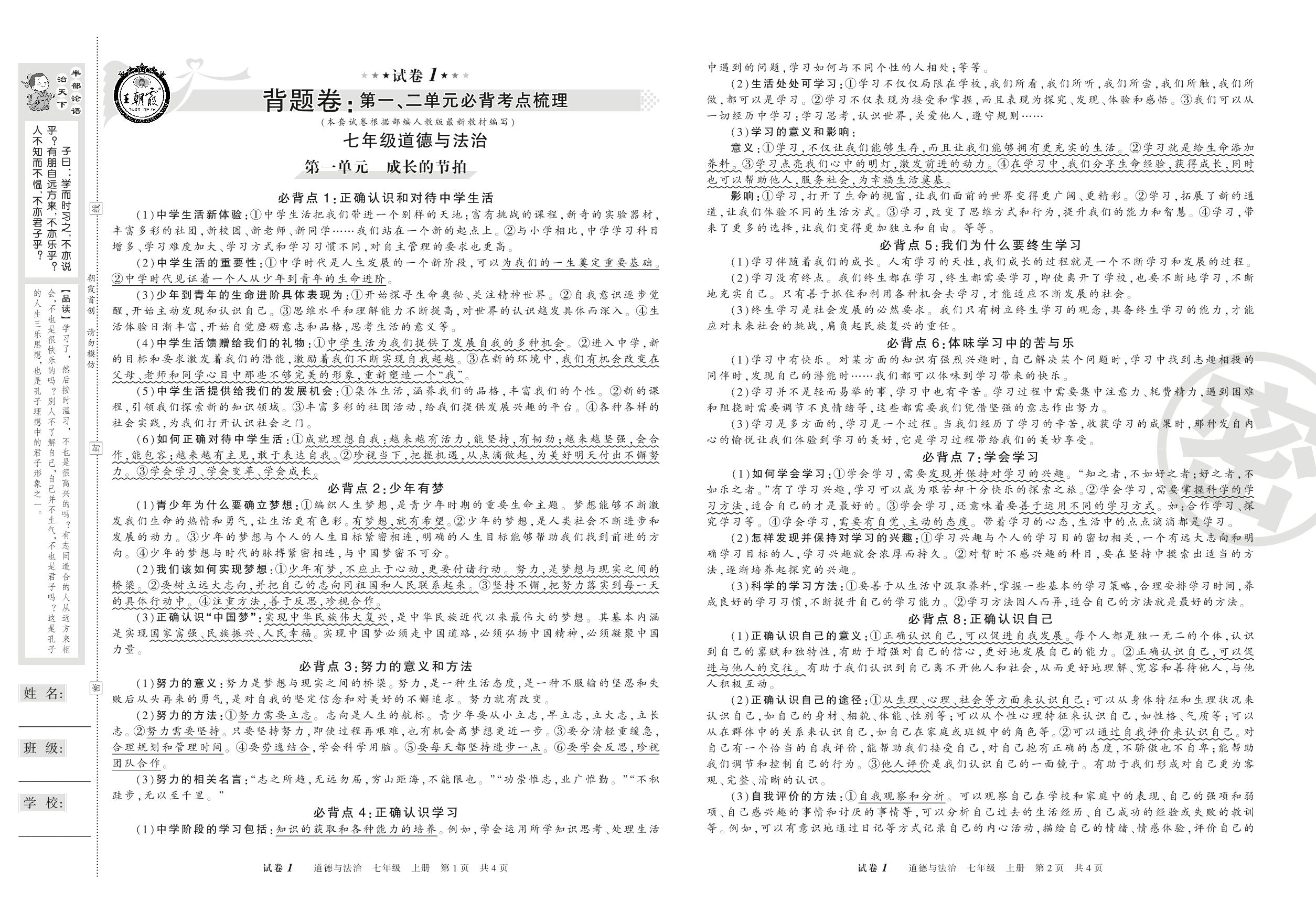 王朝霞期末背题卷——第一、二单元必背考点梳理七年级上册道德与法治(人教版)_R210812151459【1】