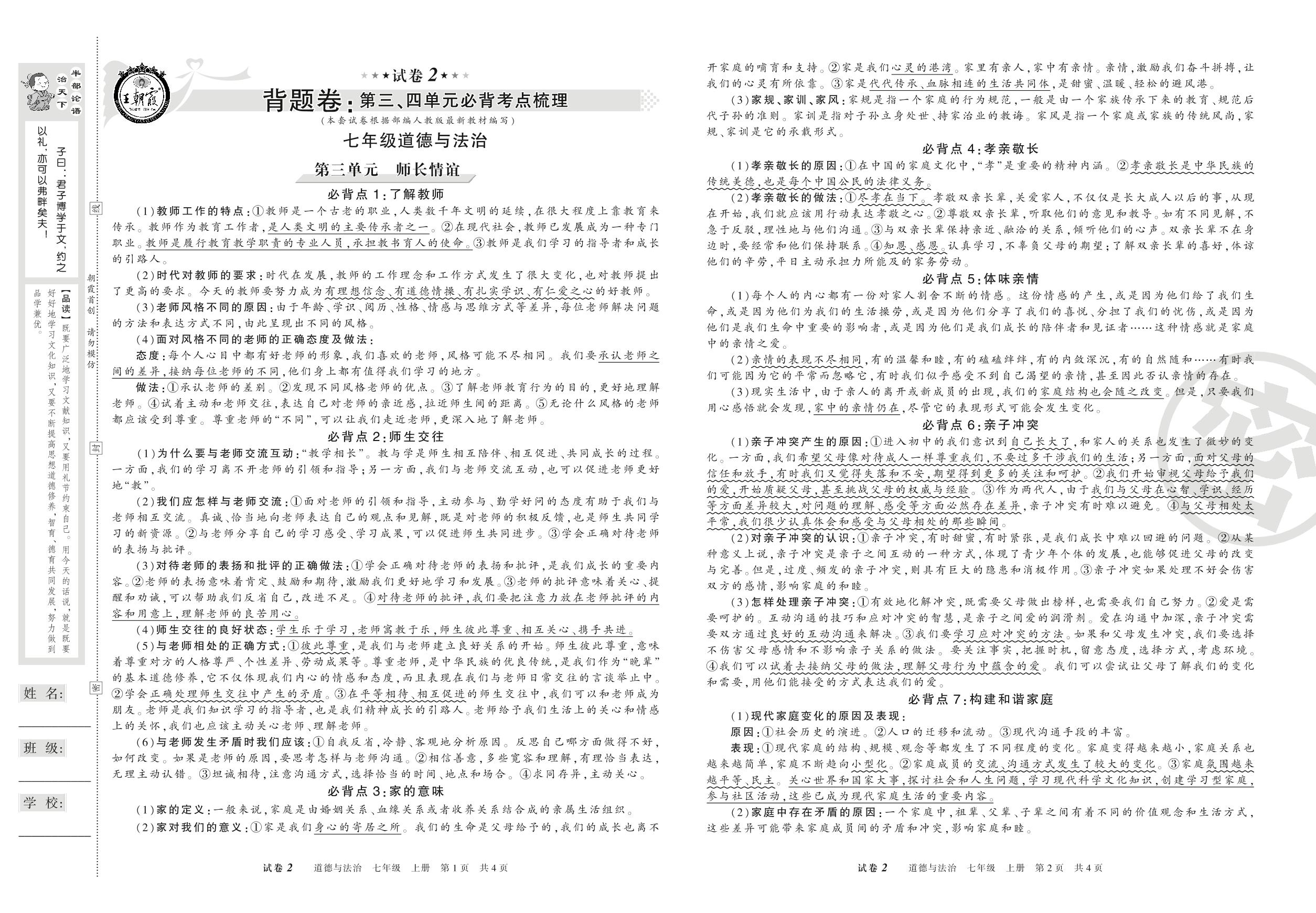 王朝霞期末背题卷——第三、四单元必背考点梳理七年级上册道德与法治(人教版)_R210812151510【2】