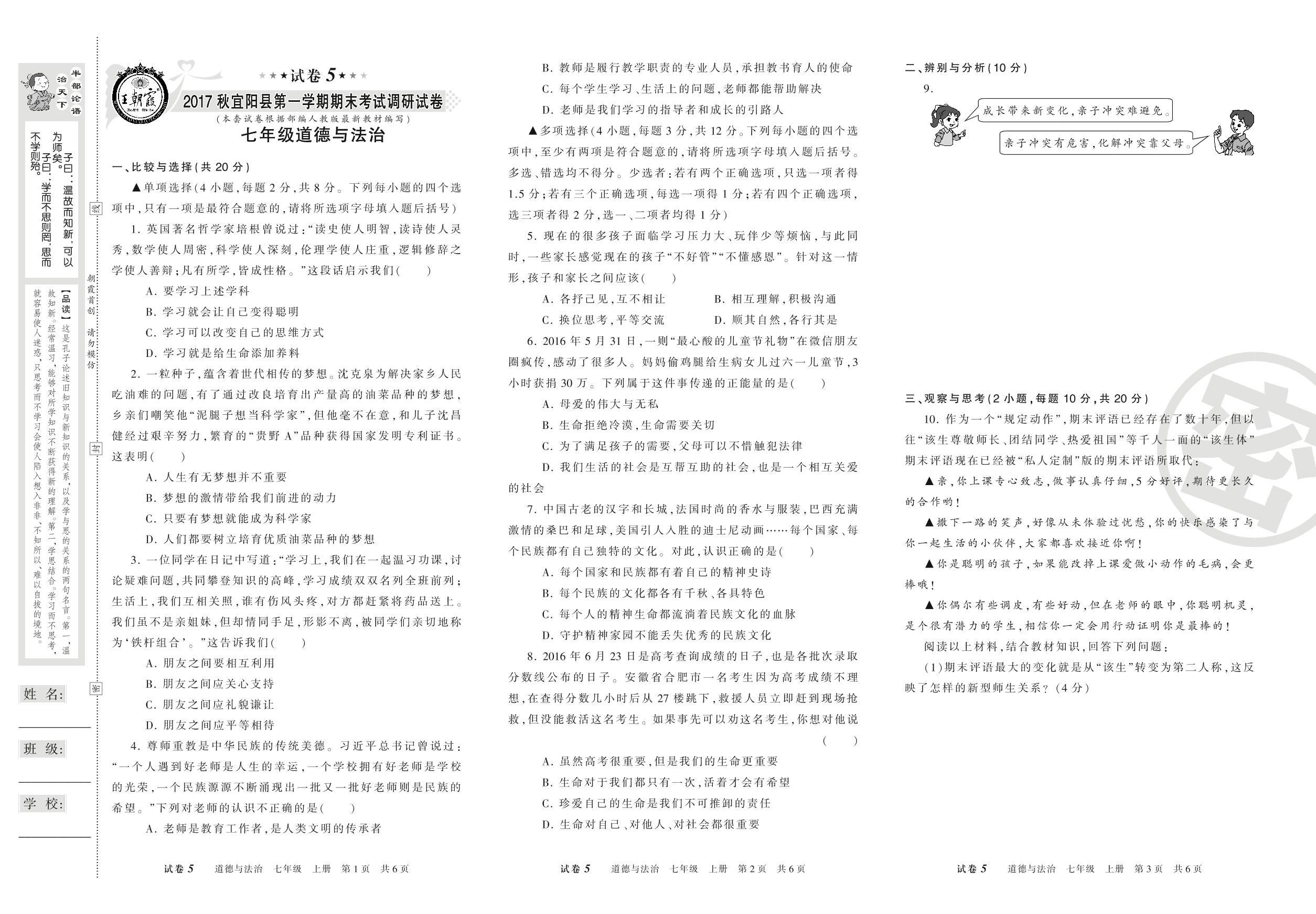 2016-2017学年第一学期洛阳市宜阳县七年级道德与法治试卷(人教版)【5】