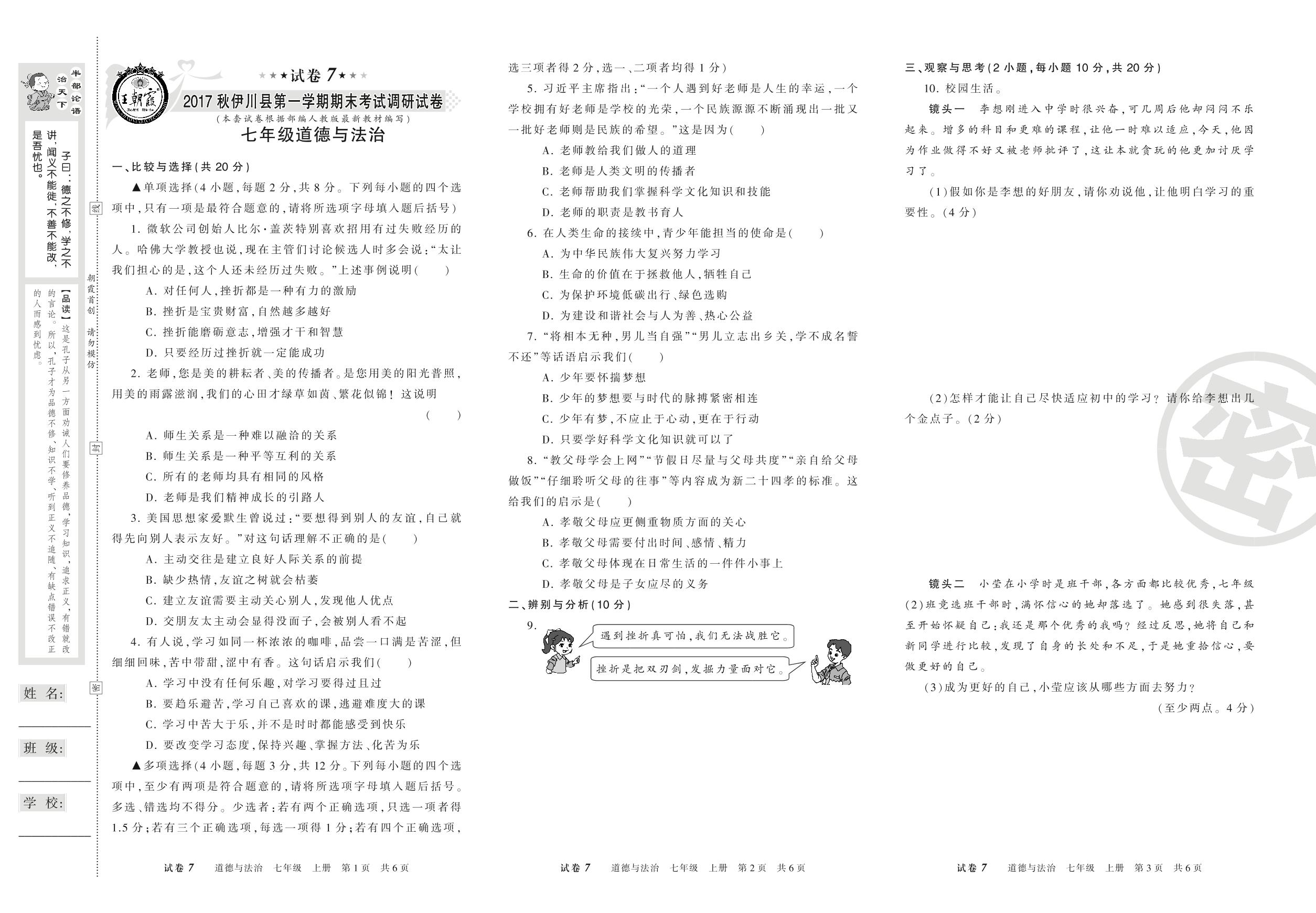 2016-2017学年第一学期洛阳市伊川县七年级道德与法治试卷(人教版)【7】