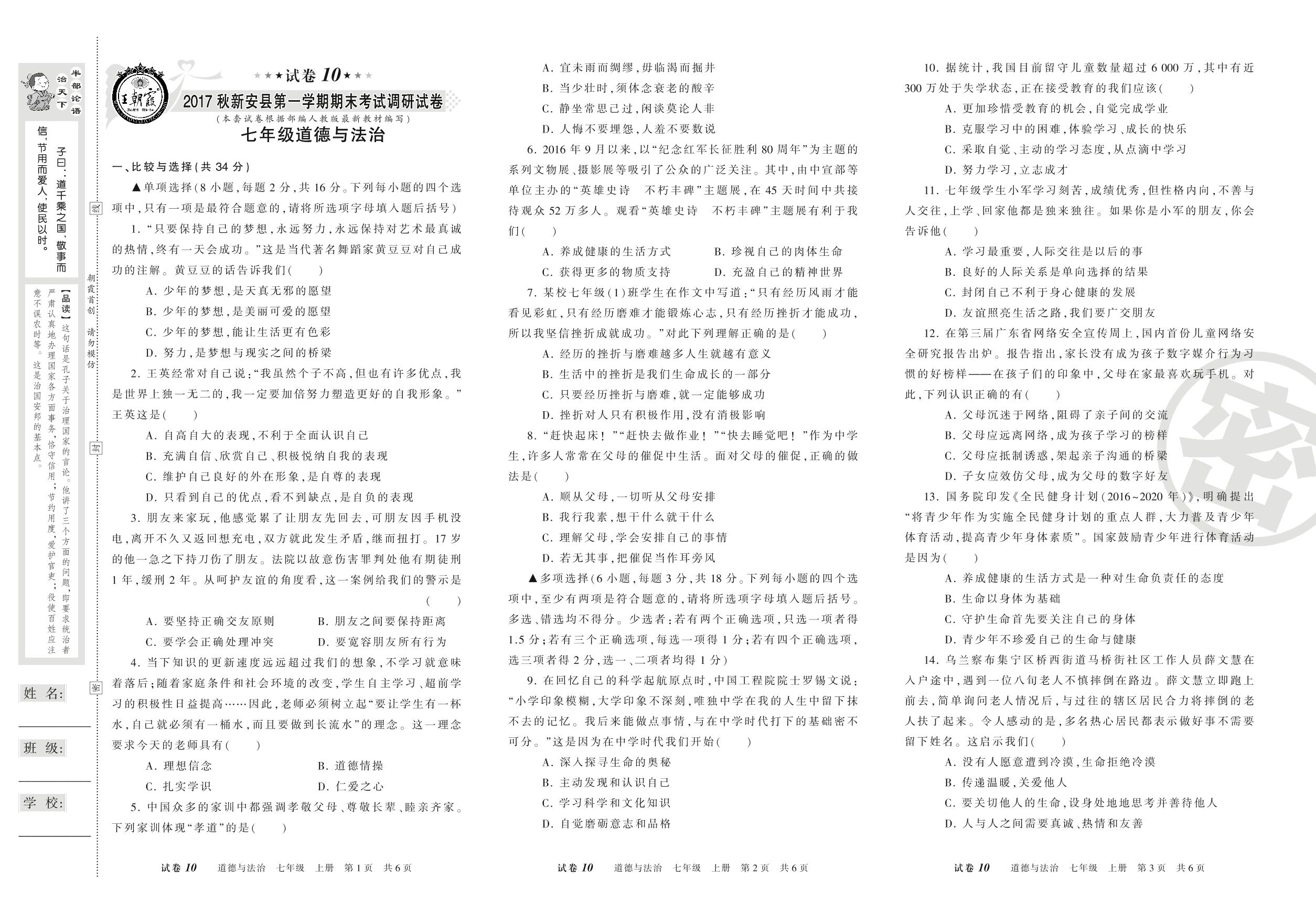 2016-2017学年第一学期洛阳市新安县七年级道德与法治试卷(人教版)【10】