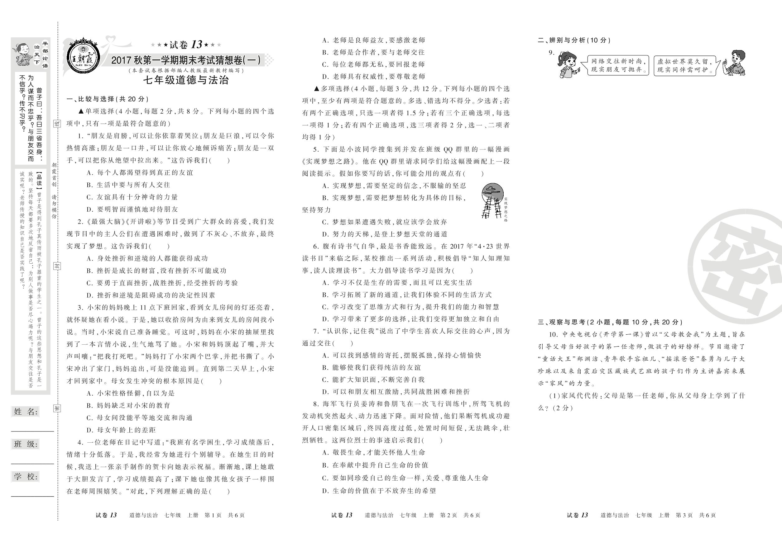 王朝霞期末猜想卷七年级上册道德与法治(人教版)【13】