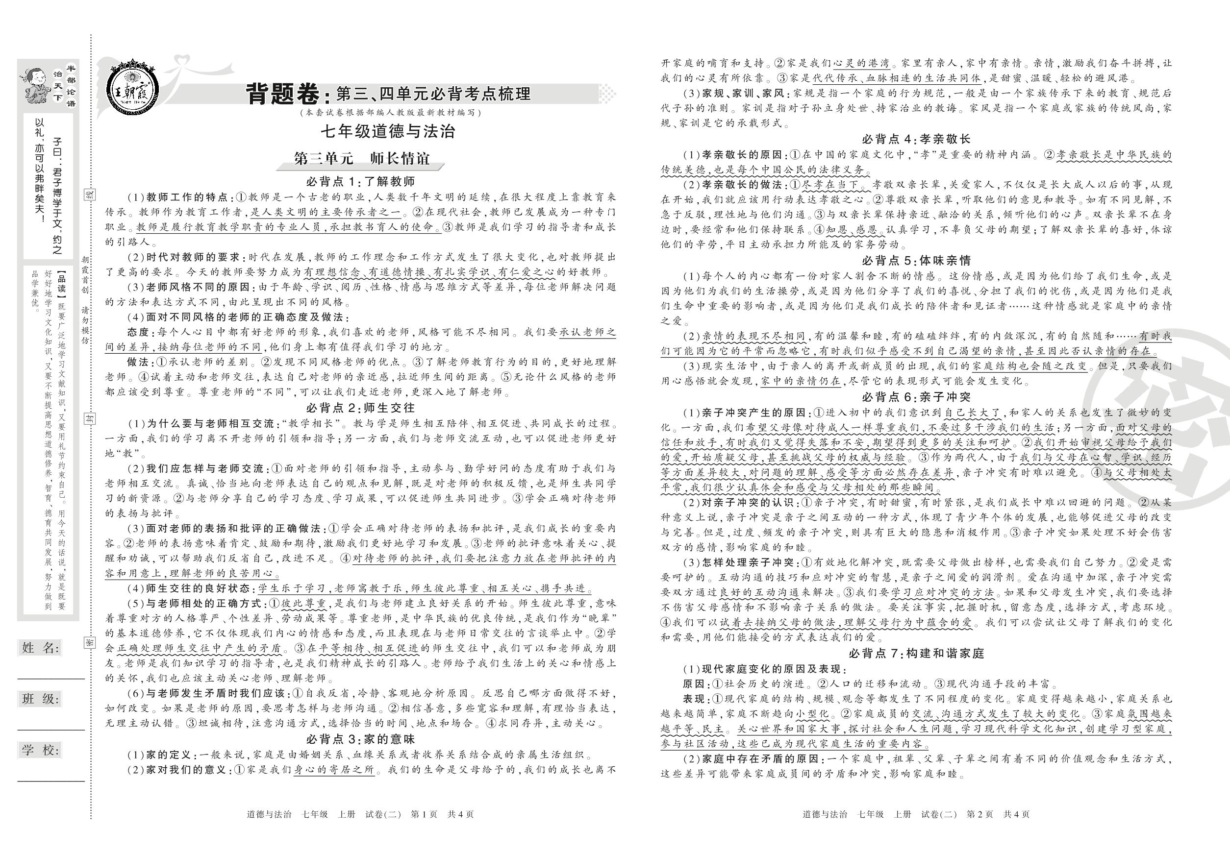 王朝霞期末背题卷——第三、四单元必背考点梳理七年级上册道德与法治(人教版)_R210812151659【2】