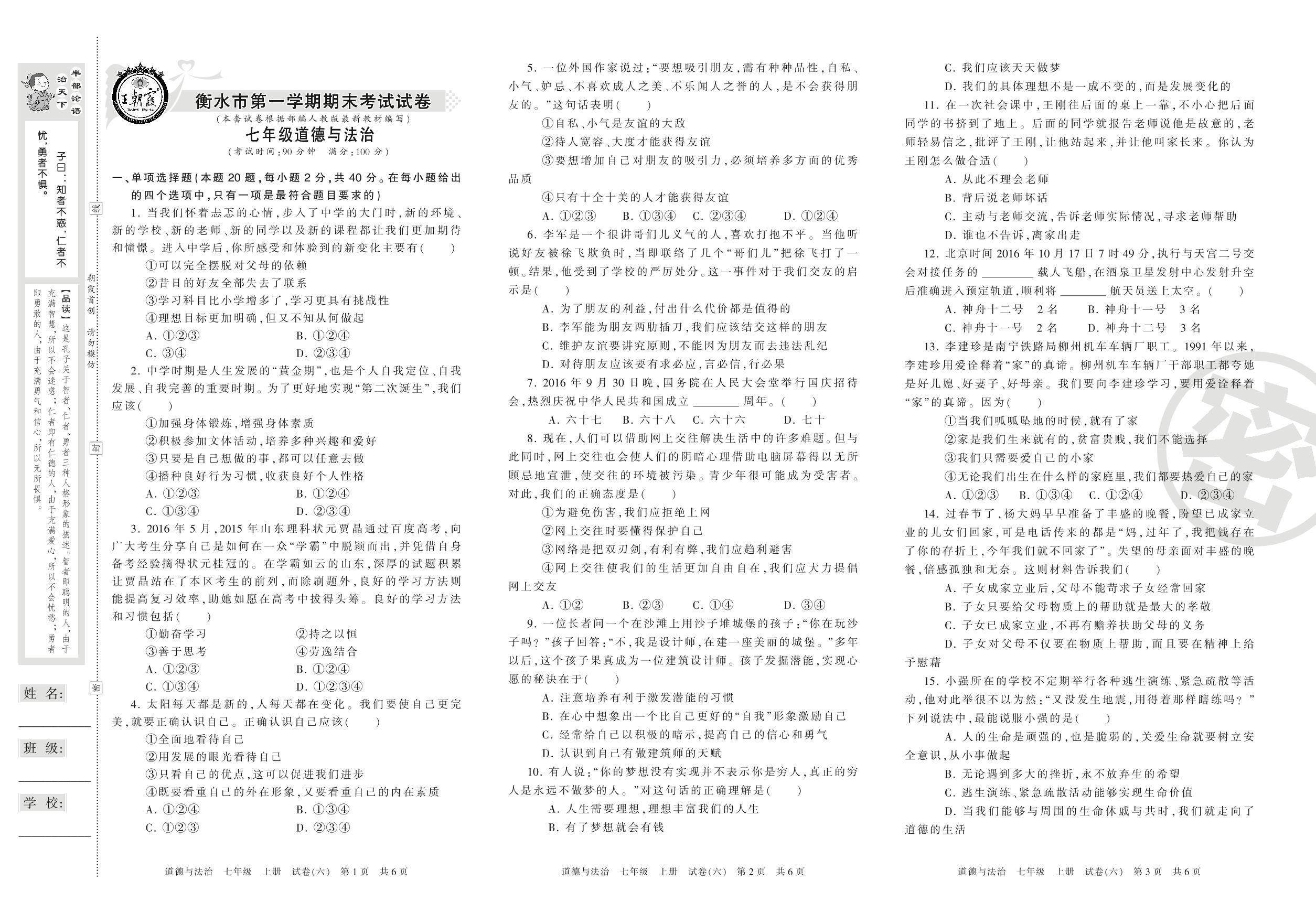 2016-2017学年第一学期衡水市七年级道德与法治试卷(人教版)【6】