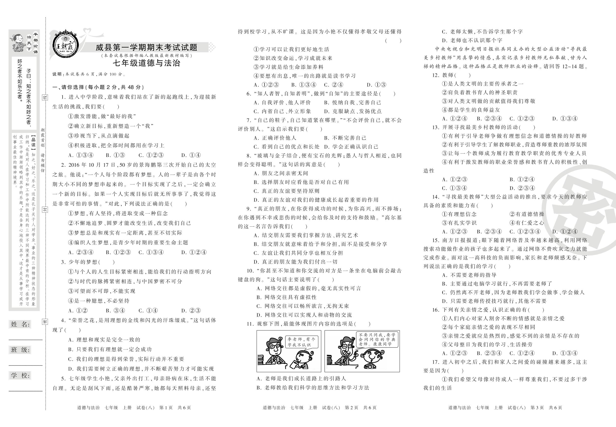 2016-2017学年第一学期邢台市威县七年级道德与法治试卷(人教版)【8】