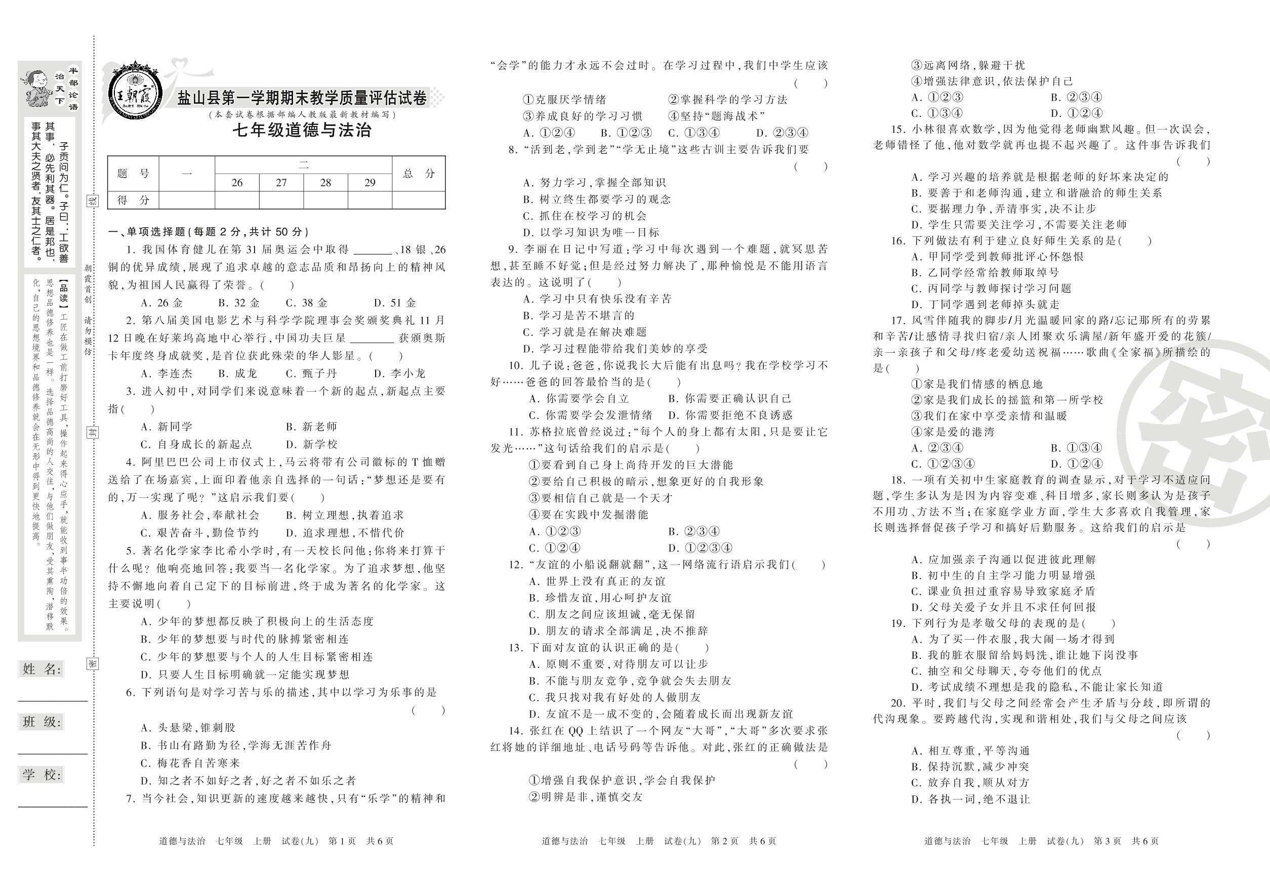 2016-2017学年第一学期沧州市盐山县七年级道德与法治试卷(人教版)【9】