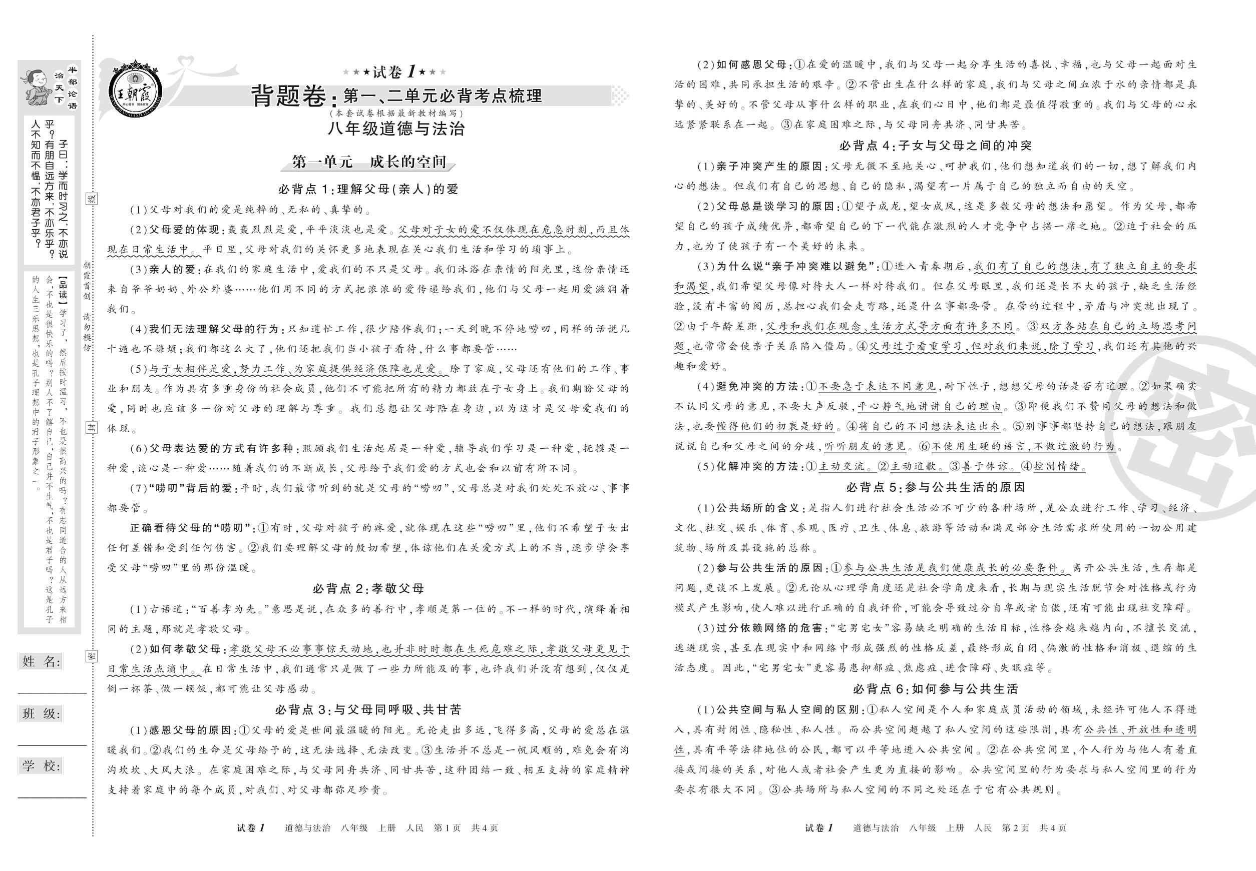 王朝霞期末背题卷——第一、二单元必背考点梳理八年级上册道德与法治(人民版)【1】