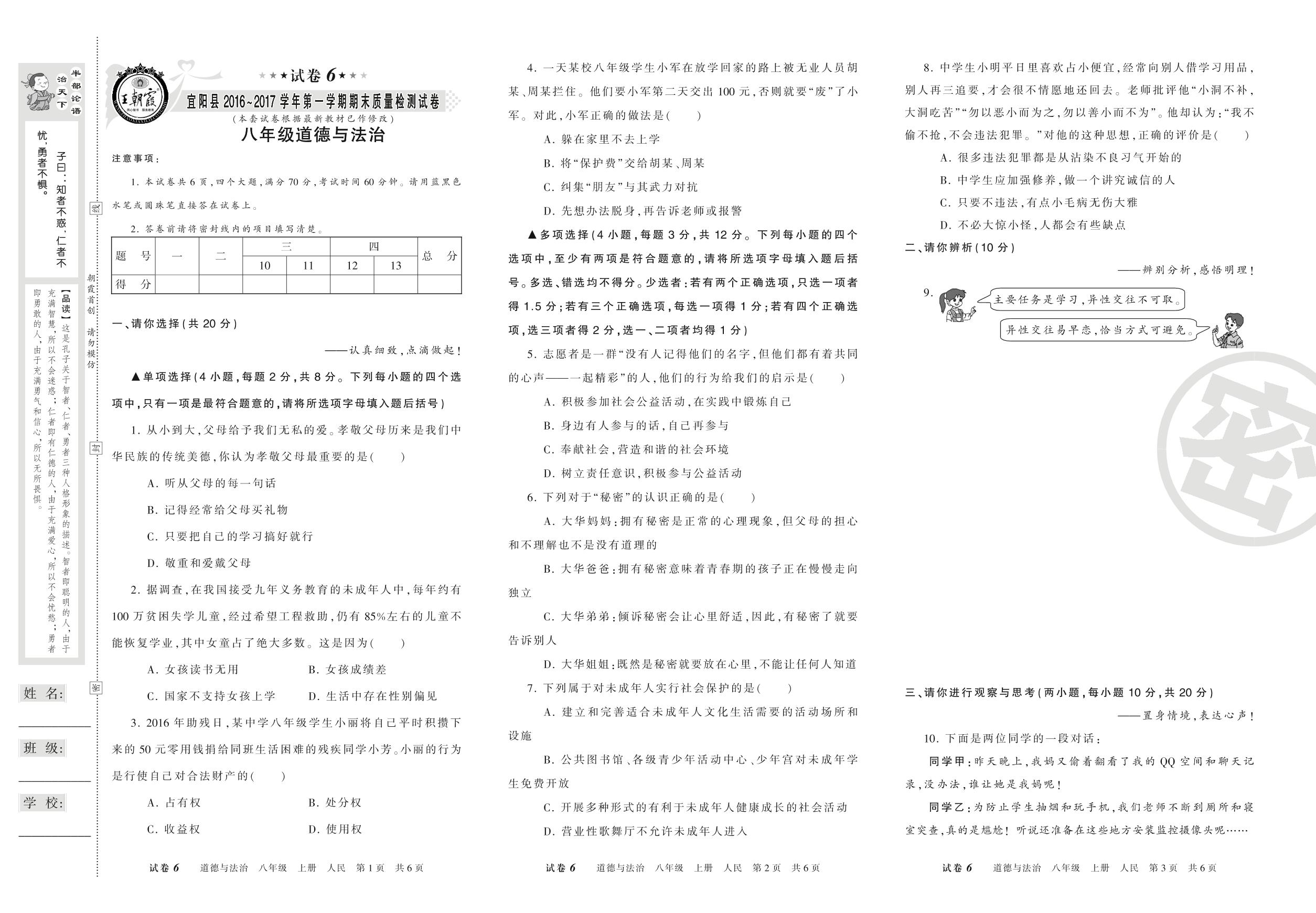 2016-2017学年第一学期洛阳市宜阳县八年级道德与法治试卷(人民版)【6】