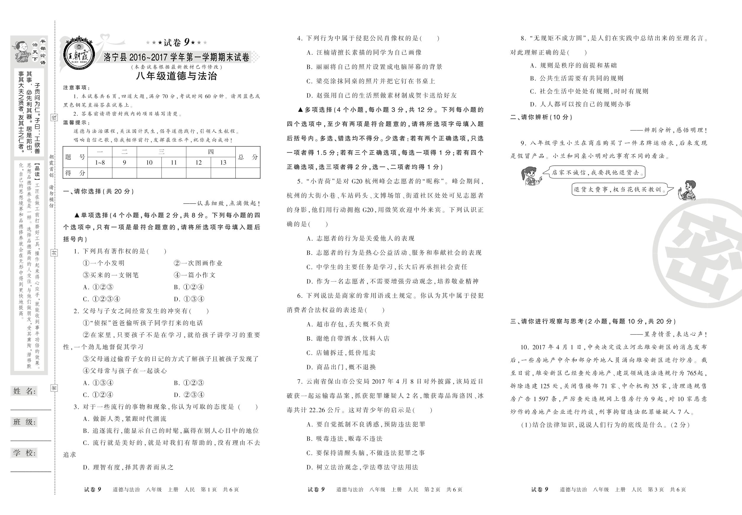 2016-2017学年第一学期洛阳市洛宁县八年级道德与法治试卷(人民版)【9】