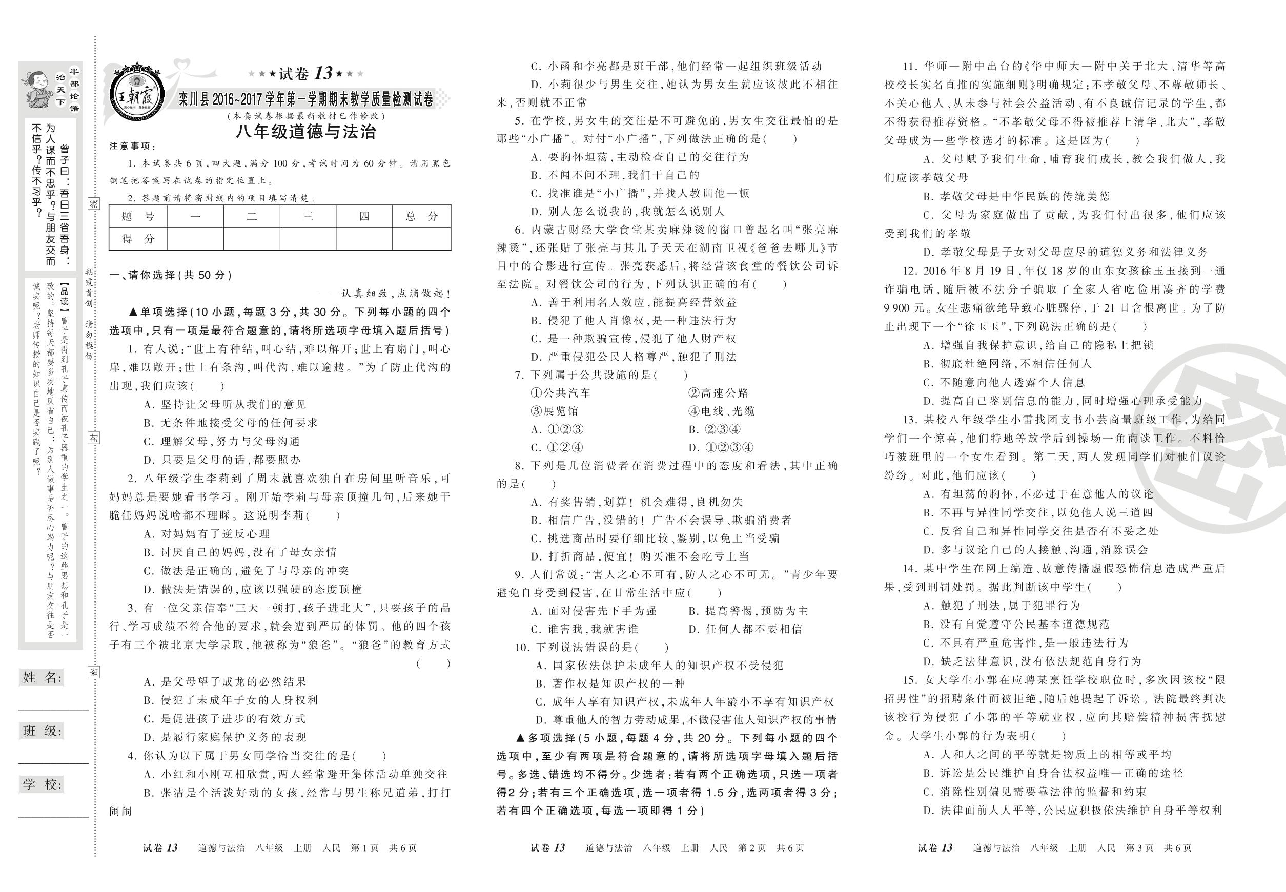 2016-2017学年第一学期洛阳市栾川县八年级道德与法治试卷(人民版)【13】