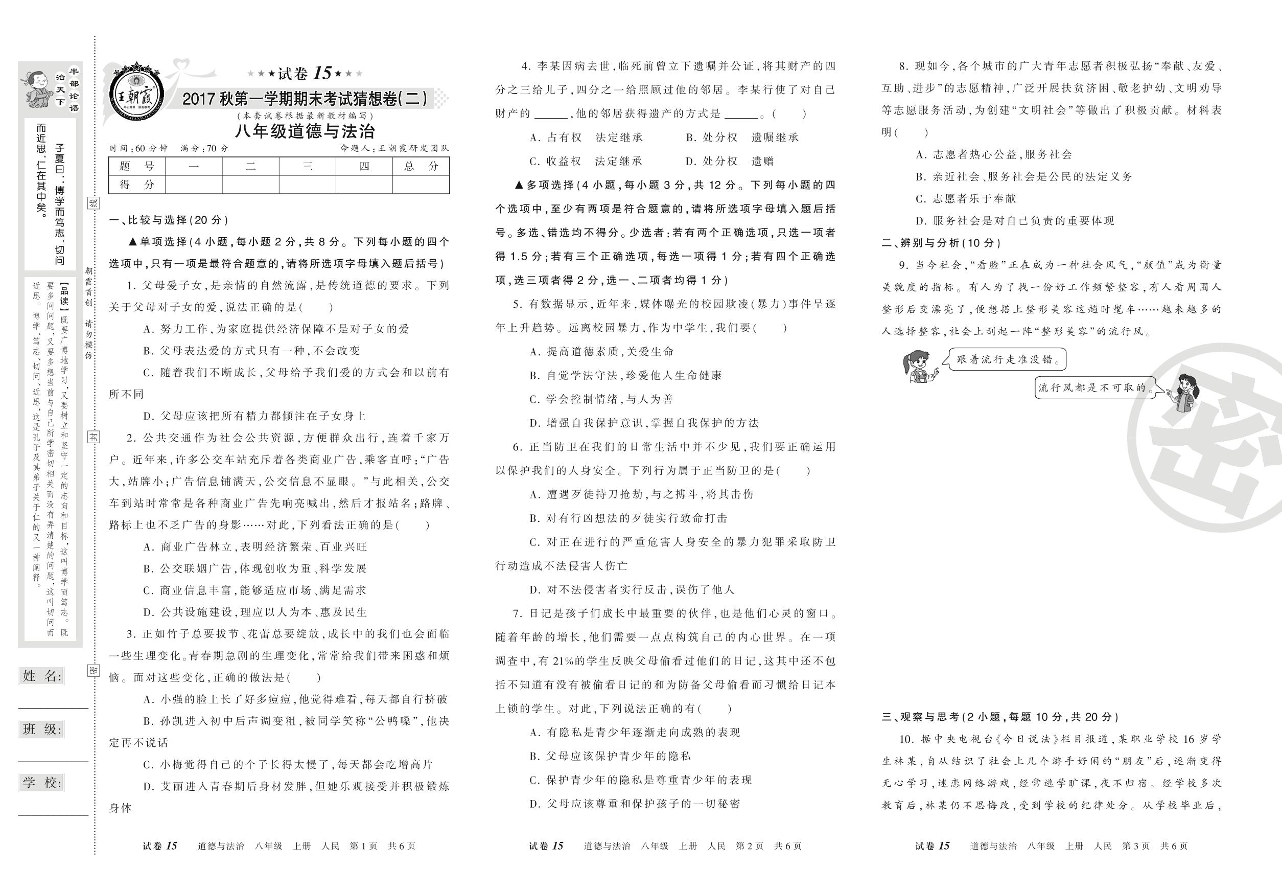 王朝霞期末猜想卷八年级上册道德与法治(人民版)【15】