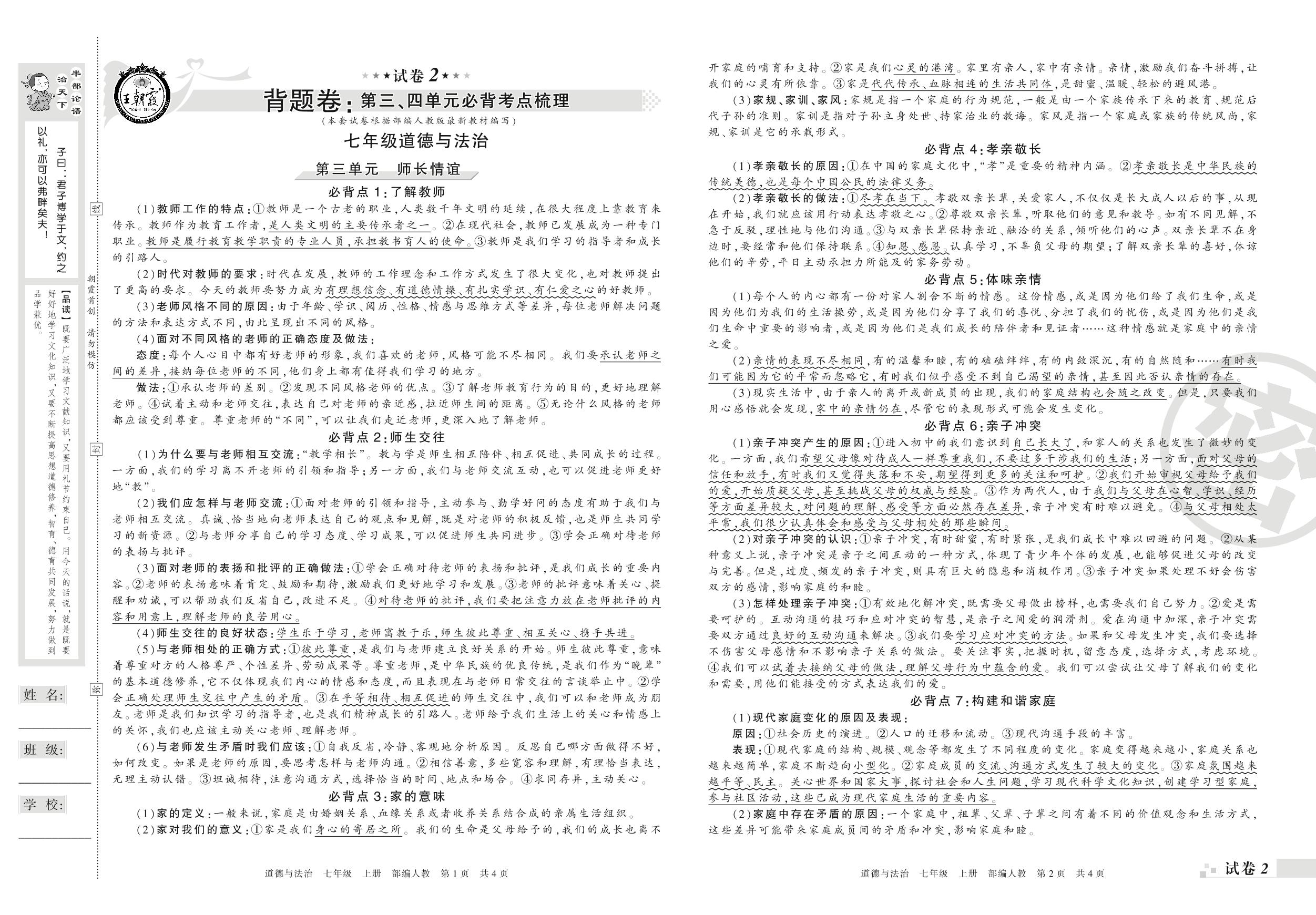 王朝霞期末背题卷——第三、四单元必背考点梳理七年级上册道德与法治(人教版)_R210812152700【2】
