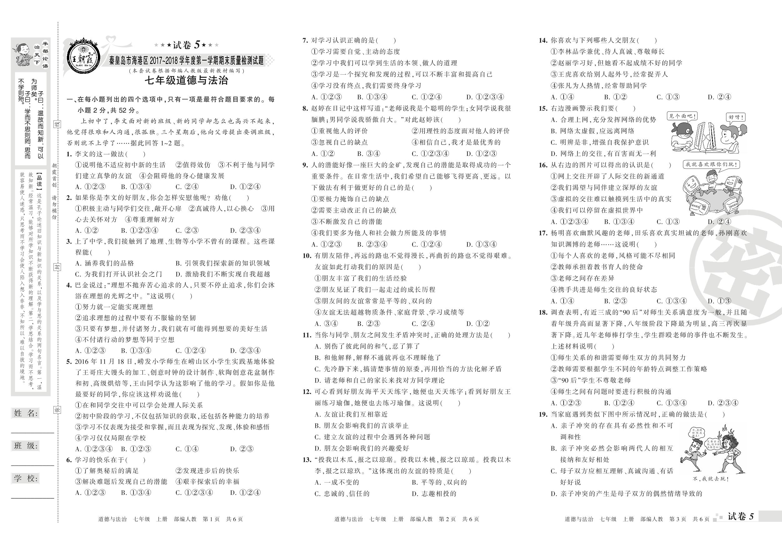 2017-2018学年第一学期秦皇岛市海港区七年级道德与法治试卷(人教版)【5】