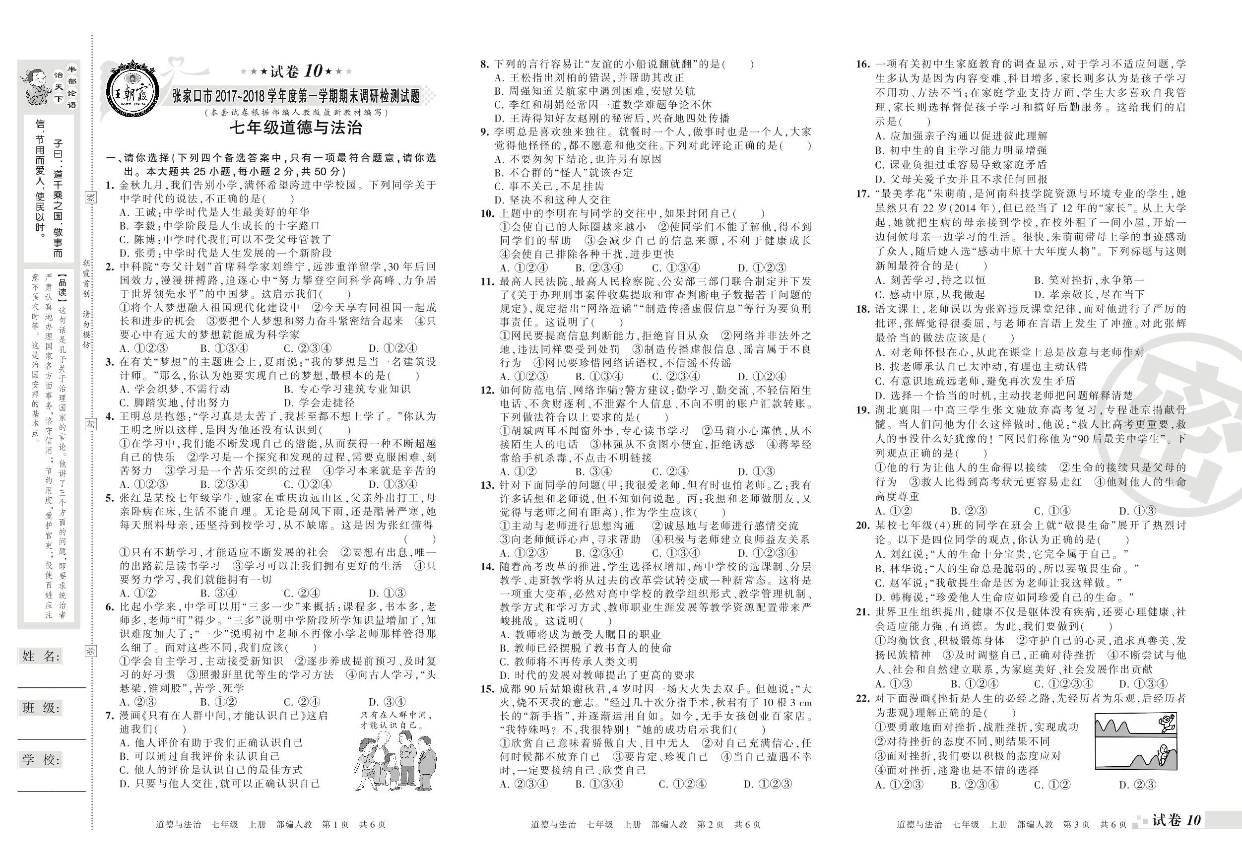 2017-2018学年第一学期张家口市七年级道德与法治试卷(人教版)【10】
