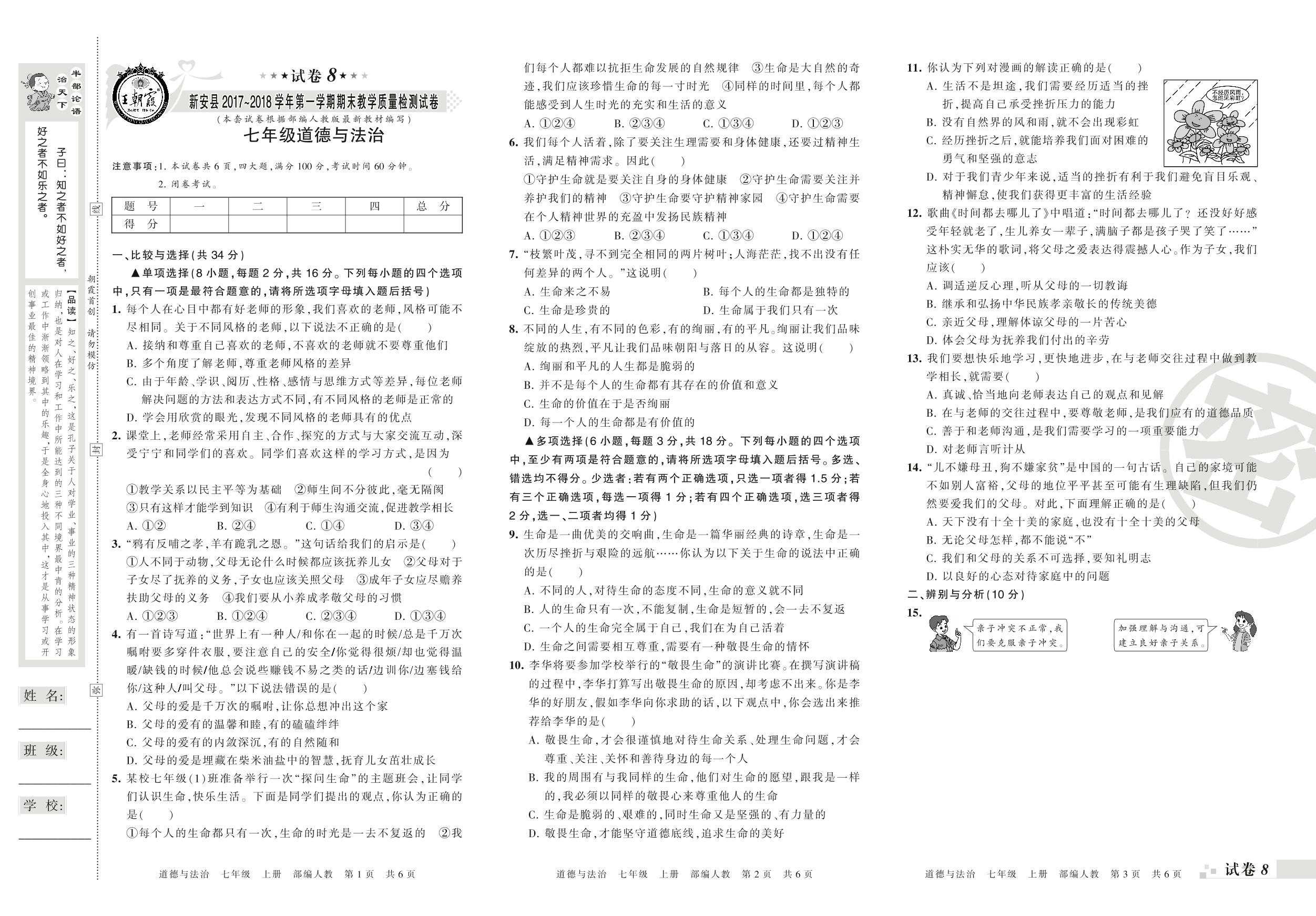 2017-2018学年第一学期洛阳市新安县七年级道德与法治试卷(人教版)【8】