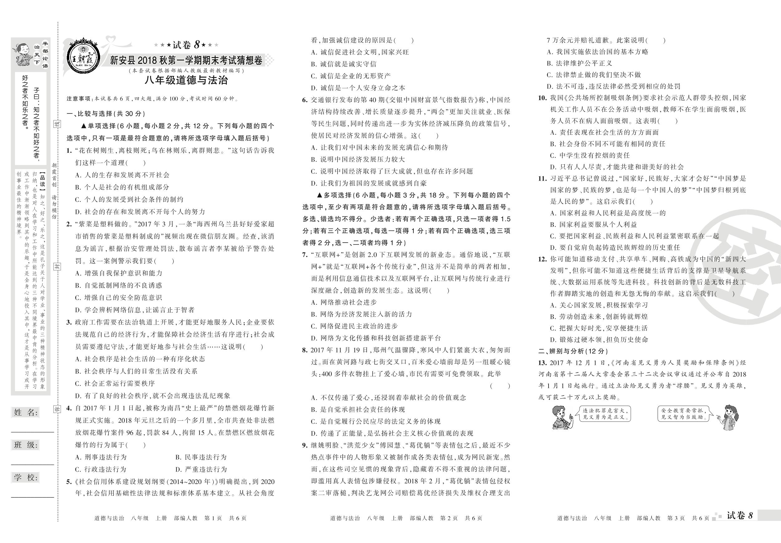2017-2018学年第一学期洛阳市新安县八年级道德与法治试卷(人教版)【8】