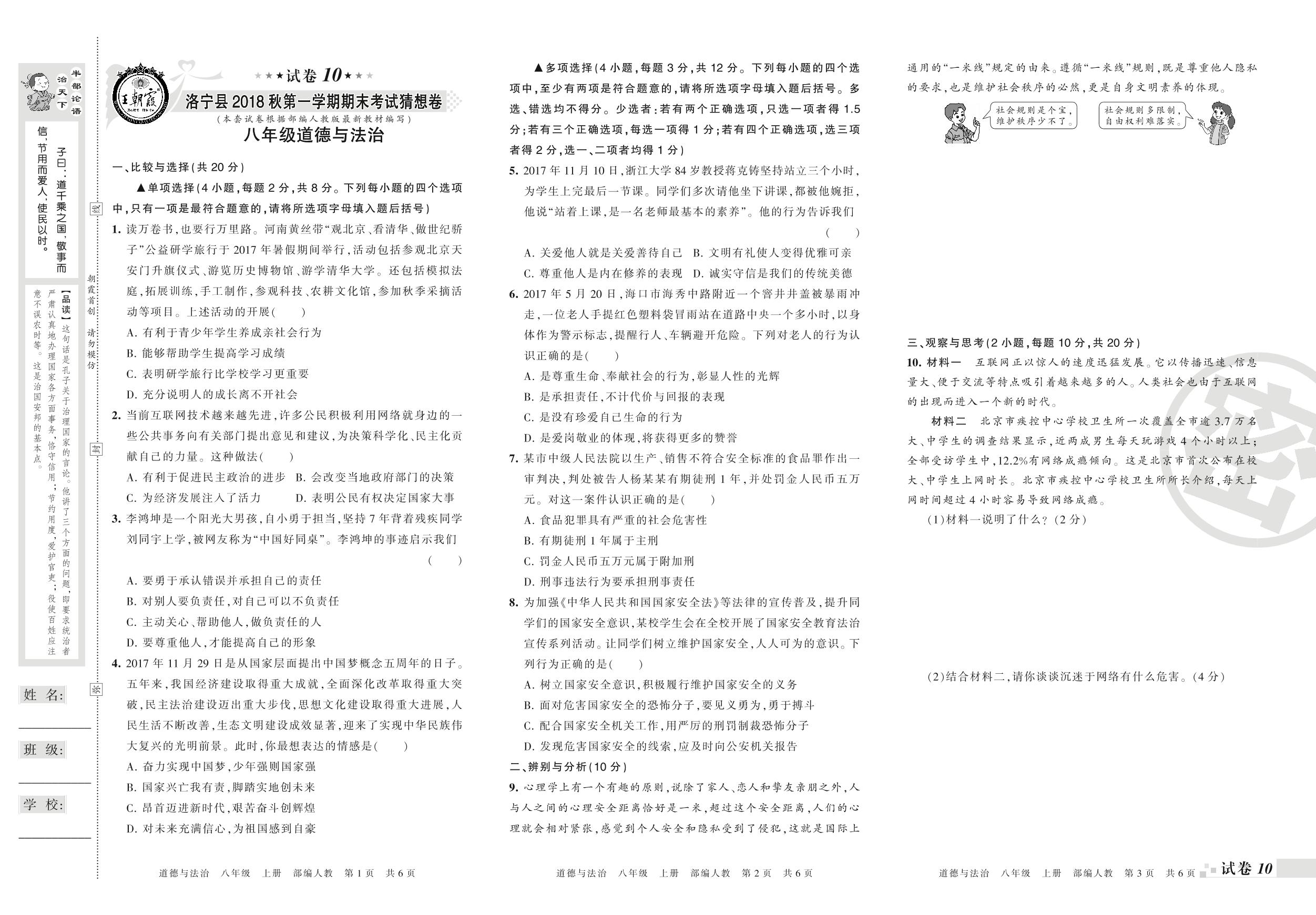 2017-2018学年第一学期洛阳市洛宁县八年级道德与法治试卷(人教版)【10】