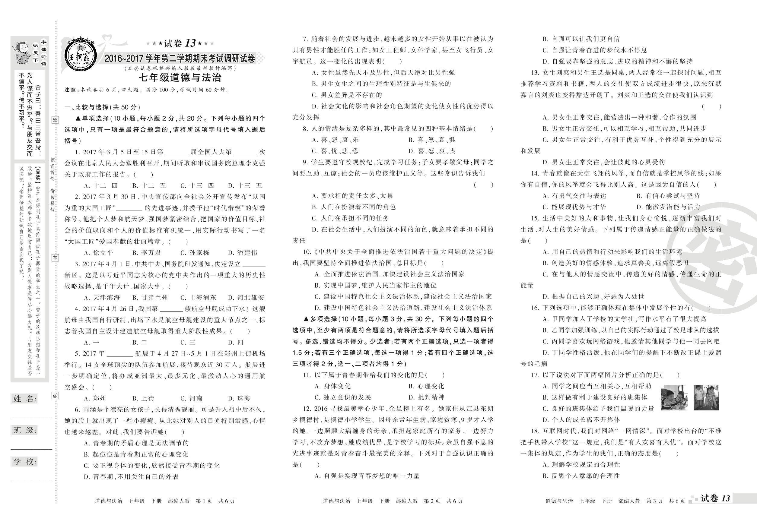 2016-2017学年第二学期期末考试调研试卷七年级下册道德与法治(人教版)【13】