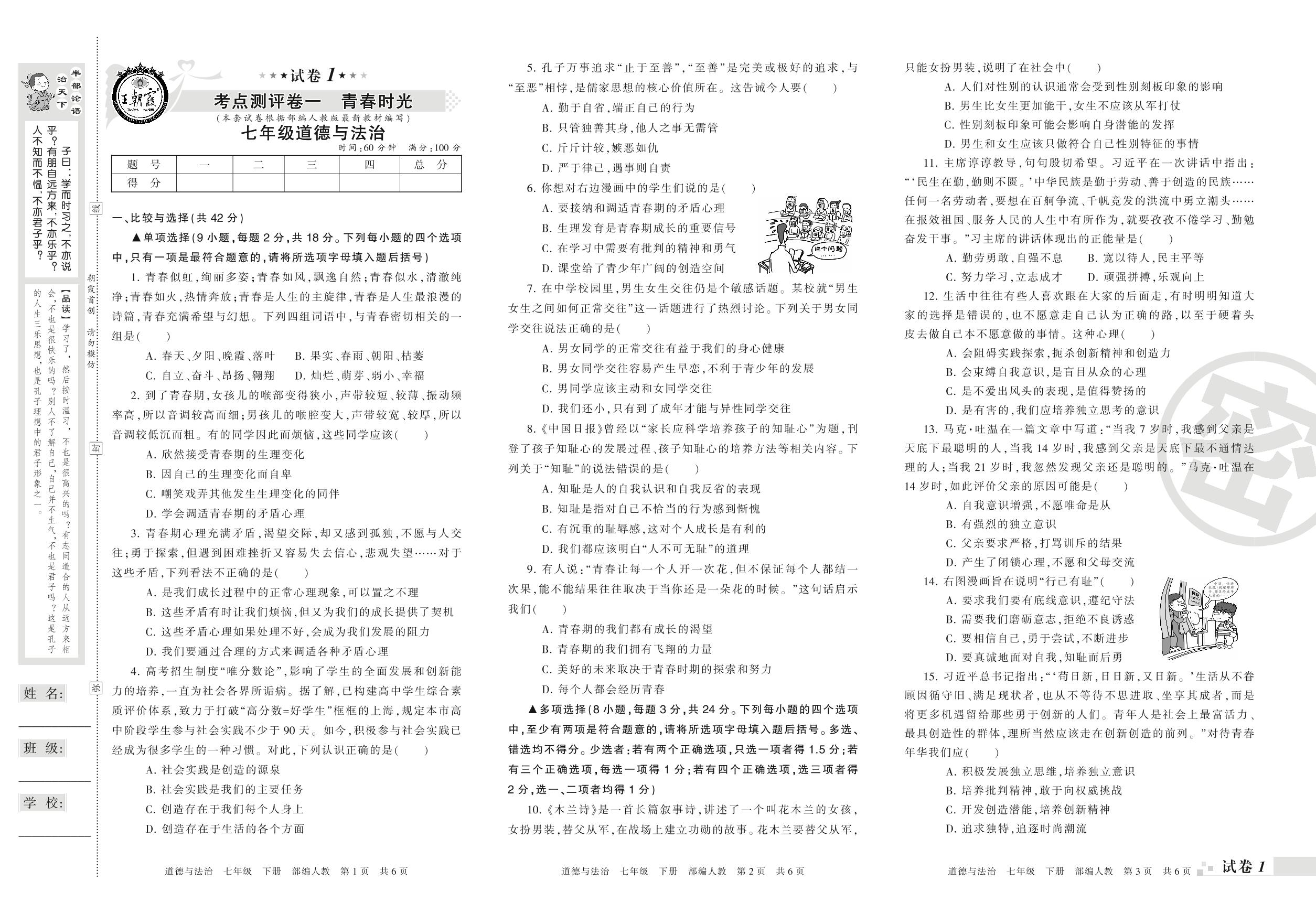 王朝霞期末测评卷——考点测评卷一 青春时光七年级下册道德与法治(人教版)【1】