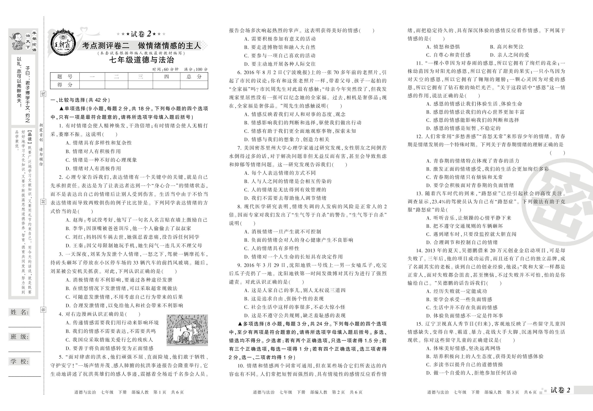 王朝霞期末测评卷——考点测评卷二 做情绪情感的主人七年级下册道德与法治(人教版)【2】