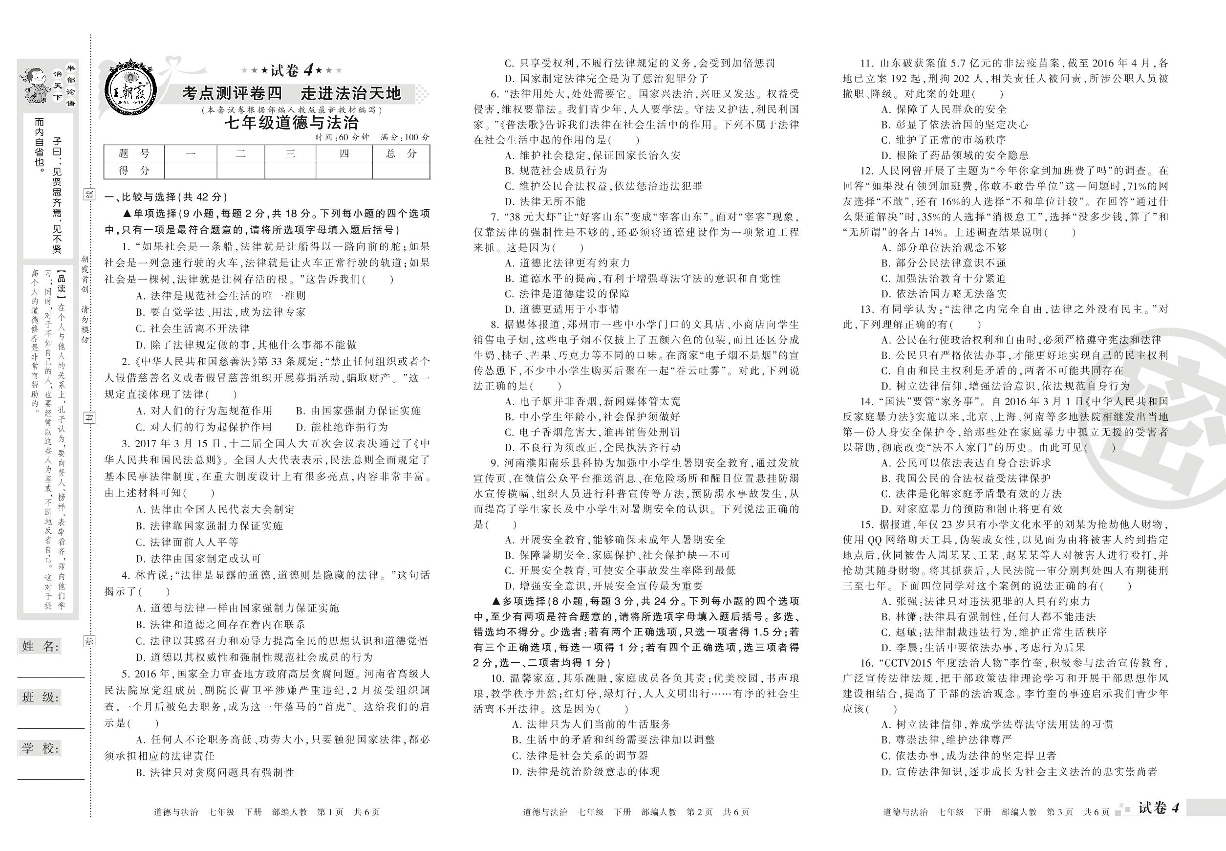 王朝霞期末测评卷——考点测评卷四 走进法治天地七年级下册道德与法治(人教版)【4】