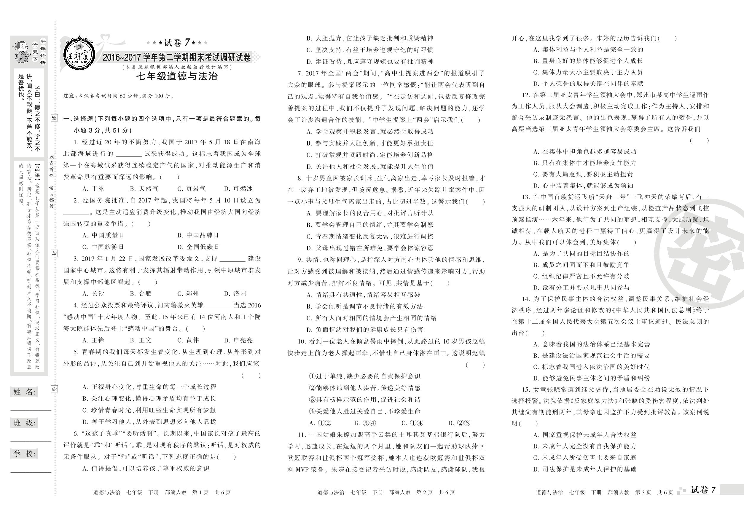 2016-2017学年第二学期期末考试调研试卷七年级下册道德与法治(人教版)【7】