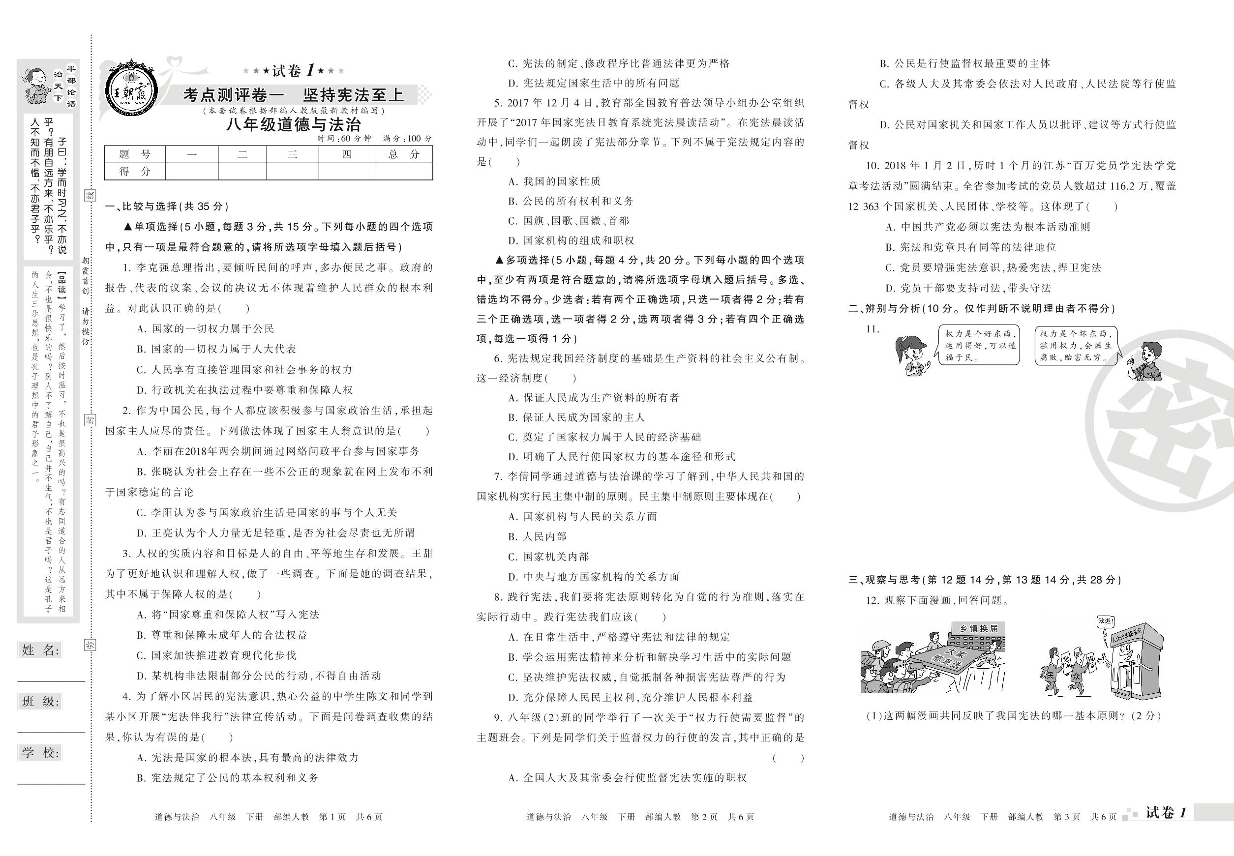 王朝霞期末测评卷——考点测评卷一 坚持宪法至上八年级下册道德与法治(人教版)【1】