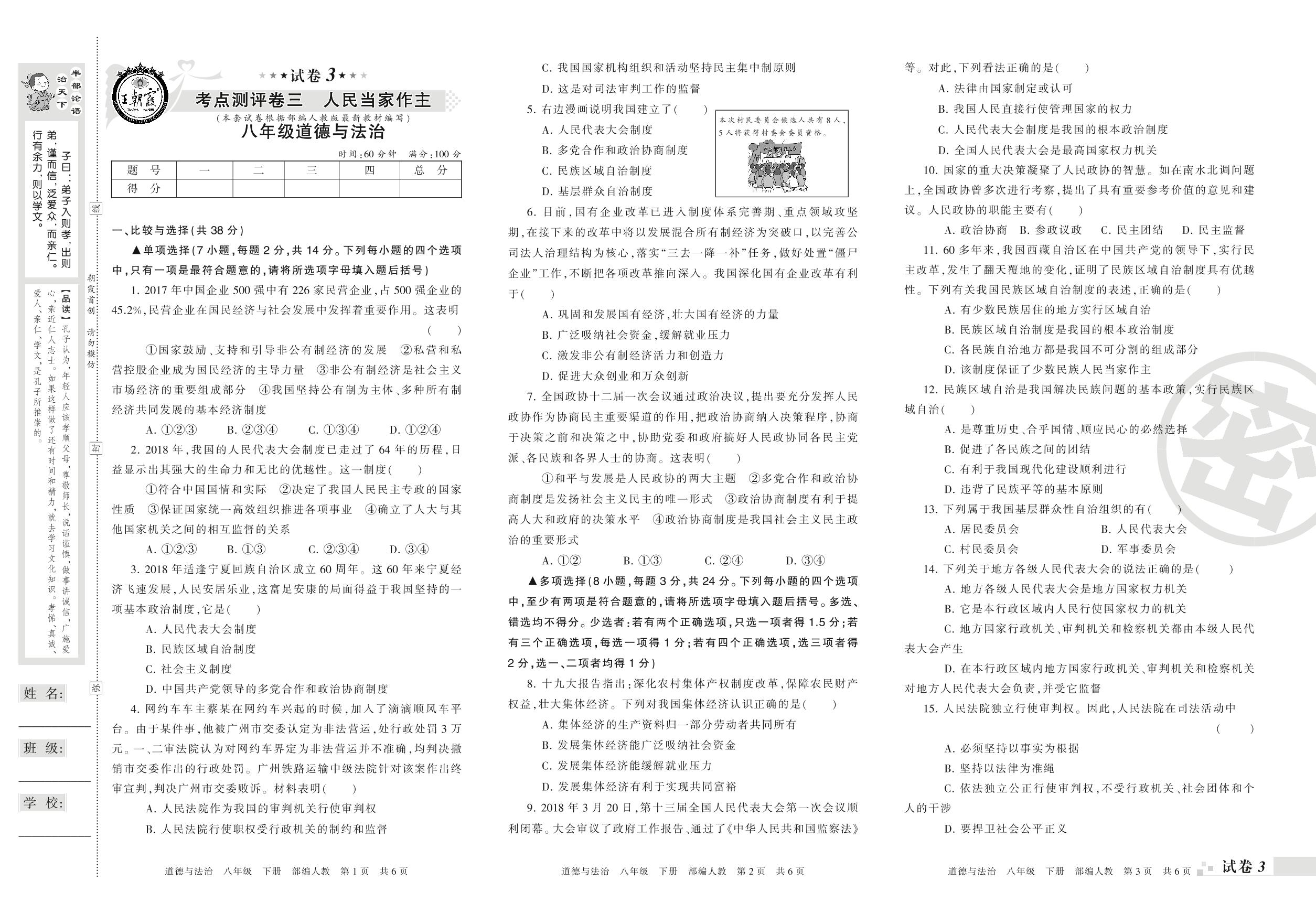 王朝霞期末测评卷——考点测评卷三 人民当家作主八年级下册道德与法治(人教版)【3】