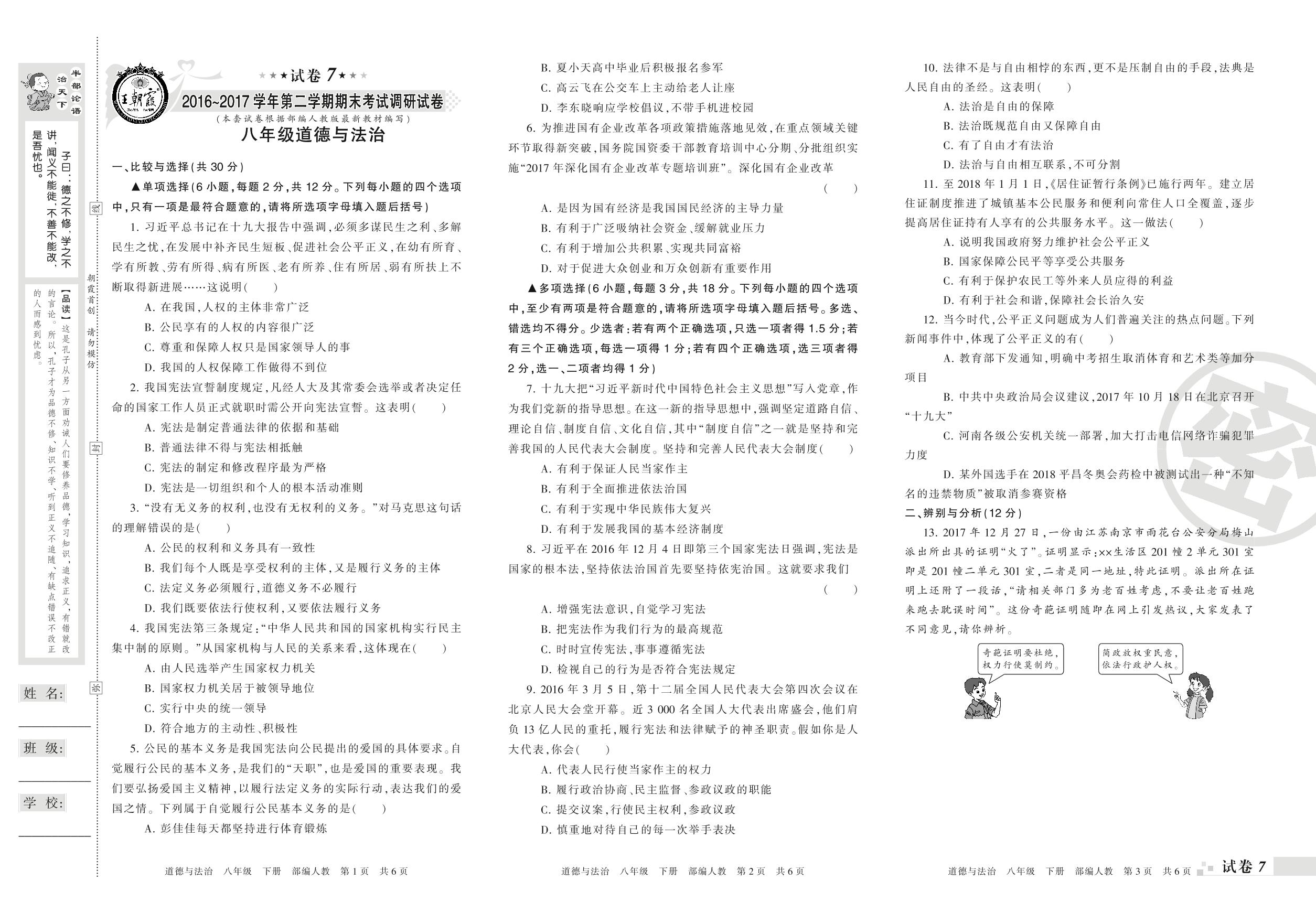 2016-2017学年第二学期期末考试调研试卷八年级下册道德与法治(人教版)【7】