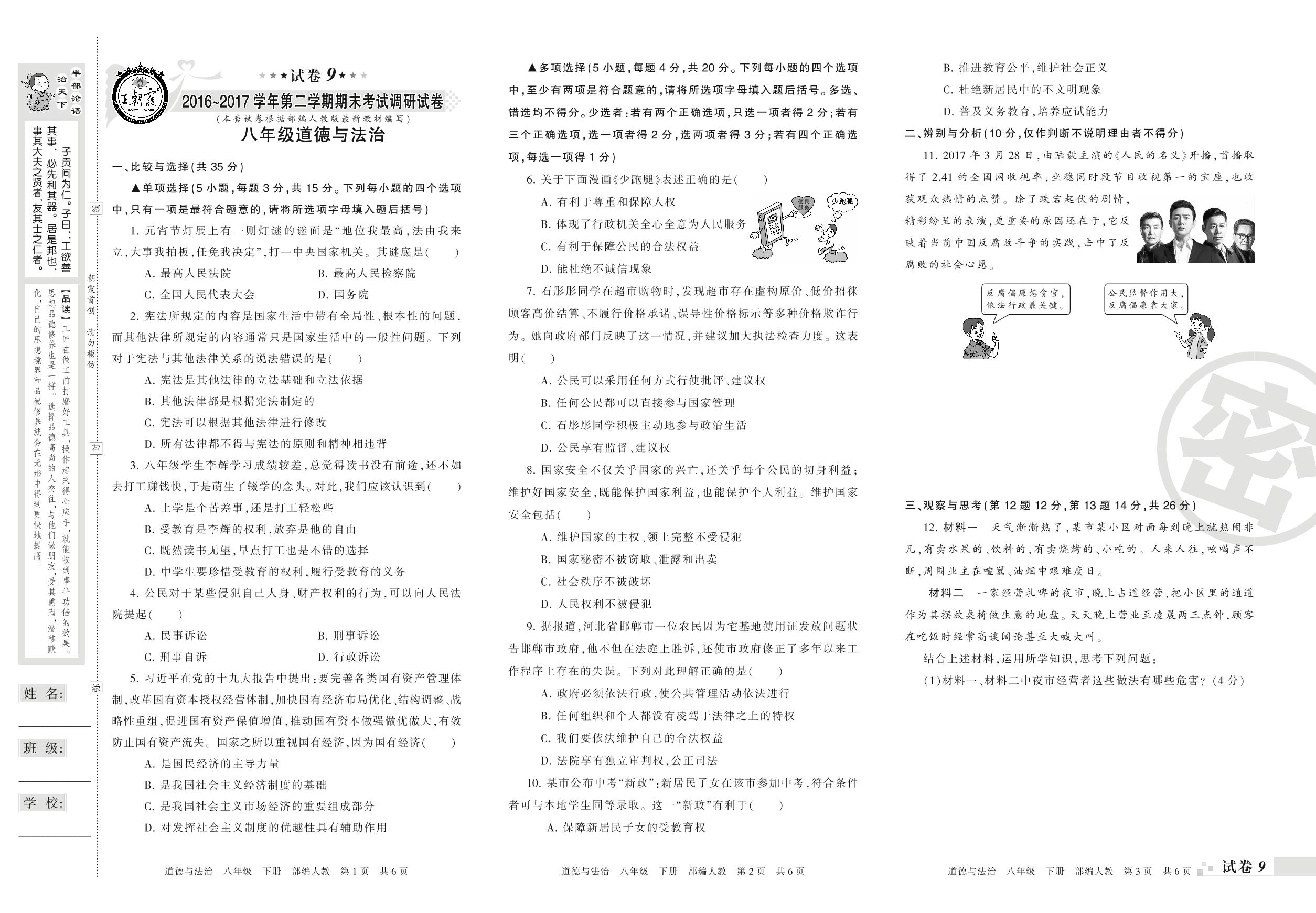 2016-2017学年第二学期期末考试调研试卷八年级下册道德与法治(人教版)【9】