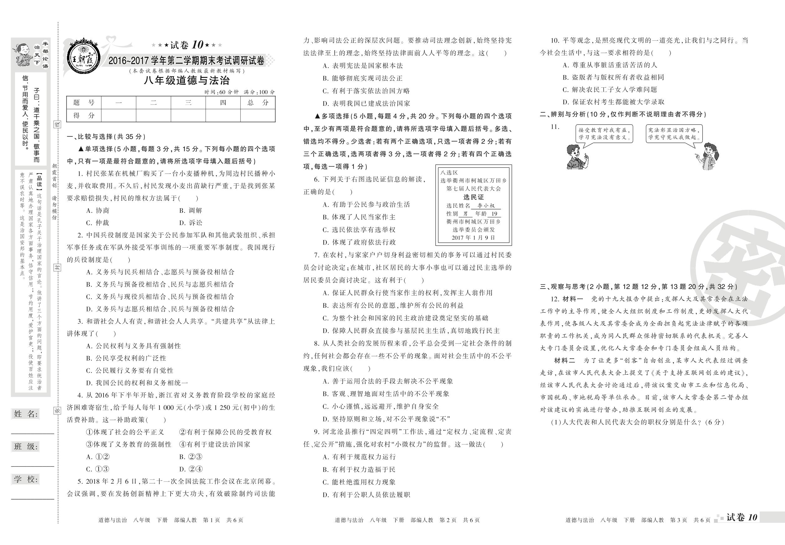 2016-2017学年第二学期期末考试调研试卷八年级下册道德与法治(人教版)【10】